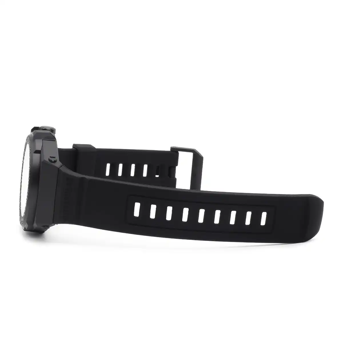 قاب گرد این ساعت از جنس پلیکربنات مقاوم ساخته شده که علاوه بر وزن سبک، استحکام بالایی در برابر ضربه و فشار دارد. قطر ۴۶.۵ میلیمتری قاب در کنار ضخامت ۱۴.۵ میلیمتر، ظاهری برجسته و مردانه ایجاد میکند و این مدل را برای افرادی با مچ متوسط تا بزرگ بسیار مناسب میسازد. بند سیلیکونی مشکی با ساختار منعطف و مقاوم، راحتی مطلوبی را در استفاده طولانیمدت فراهم کرده و در برابر تعریق، رطوبت و فرسایش مقاومت بالایی دارد.