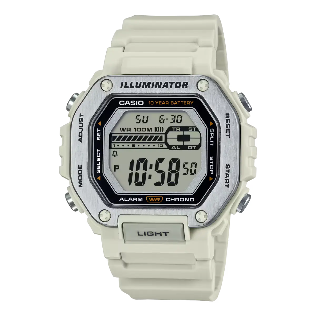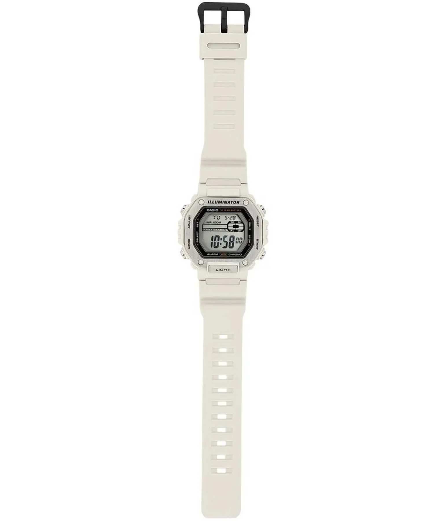 ساعت دیجیتال مردانه کاسیو مدل MWD-110H-8AVDF با طراحی اسپرت، مدرن و مقاوم، انتخابی عالی برای آقایانی است که به دنبال ساعتی کاربردی، سبک و مناسب استفاده روزمره و ورزشی هستند. این مدل با فرم قاب چندضلعی و ترکیب جذاب بدنه سفید و بند کرم / بژ جلوهای متفاوت و خاص دارد که بهراحتی با استایلهای اسپرت و کژوال هماهنگ میشود.