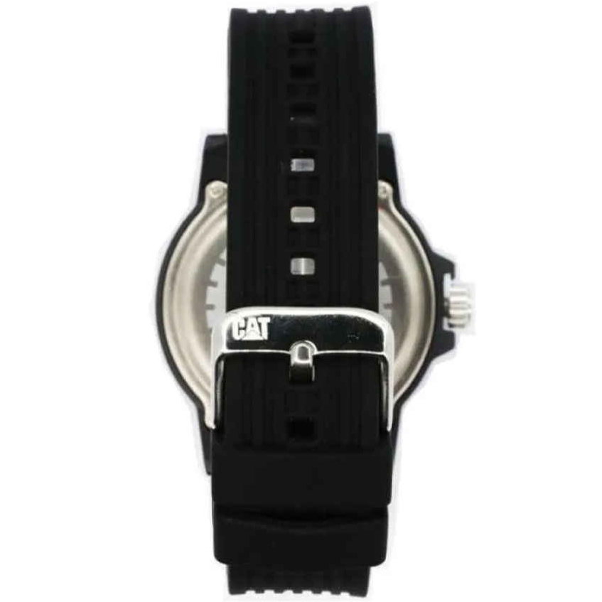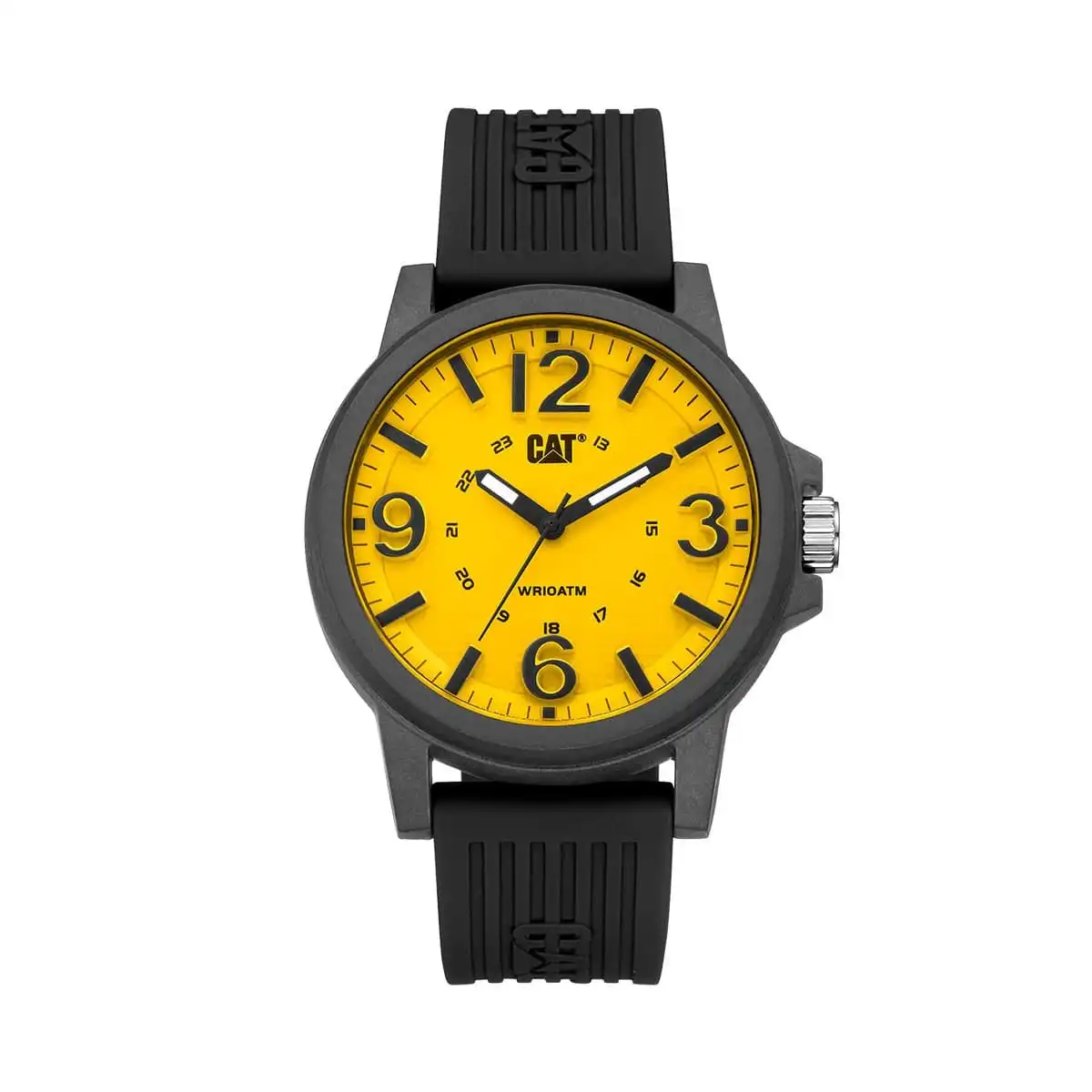 این ساعت با قاب گرد مشکی و صفحه زردِ زنده جلوهای پرانرژی و کاملاً مردانه دارد که بهسرعت جلب توجه میکند. ترکیب رنگی مشکی و زرد، امضای شناختهشده کاترپیلار است و حس قدرت و پویایی را منتقل میکند. قاب با عرض حدود 44 میلیمتر روی مچ جلوهای اسپرت و متعادل ایجاد میکند.