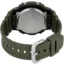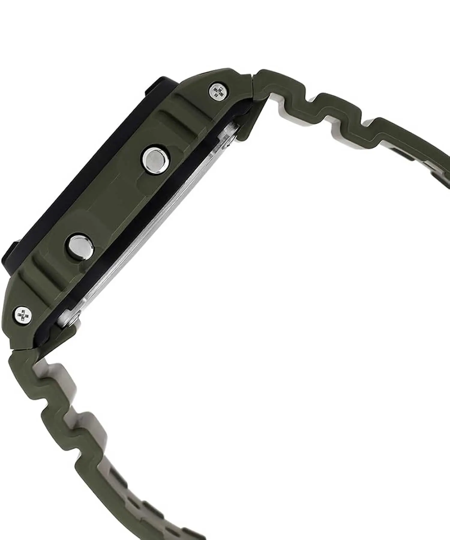 فرم قاب چندضلعی این مدل، امضای همیشگی سری DW-5600 محسوب میشود که حس نوستالژیک و اصالت برند G-SHOCK را زنده نگه میدارد. بدنه و قاب ساعت از رزین مقاوم ساخته شدهاند که ضمن کاهش وزن، مقاومت بالایی در برابر ضربه و فشارهای محیطی ایجاد میکند. ترکیب رنگی خاص این مدل شامل بدنه نقرهای، قاب و بند زیتونی در کنار صفحه مشکی/دودی، ظاهری نظامی، کاربردی و بسیار جذاب به ساعت بخشیده است. این رنگبندی بهراحتی با استایلهای اسپرت، خیابانی و روزمره هماهنگ میشود.