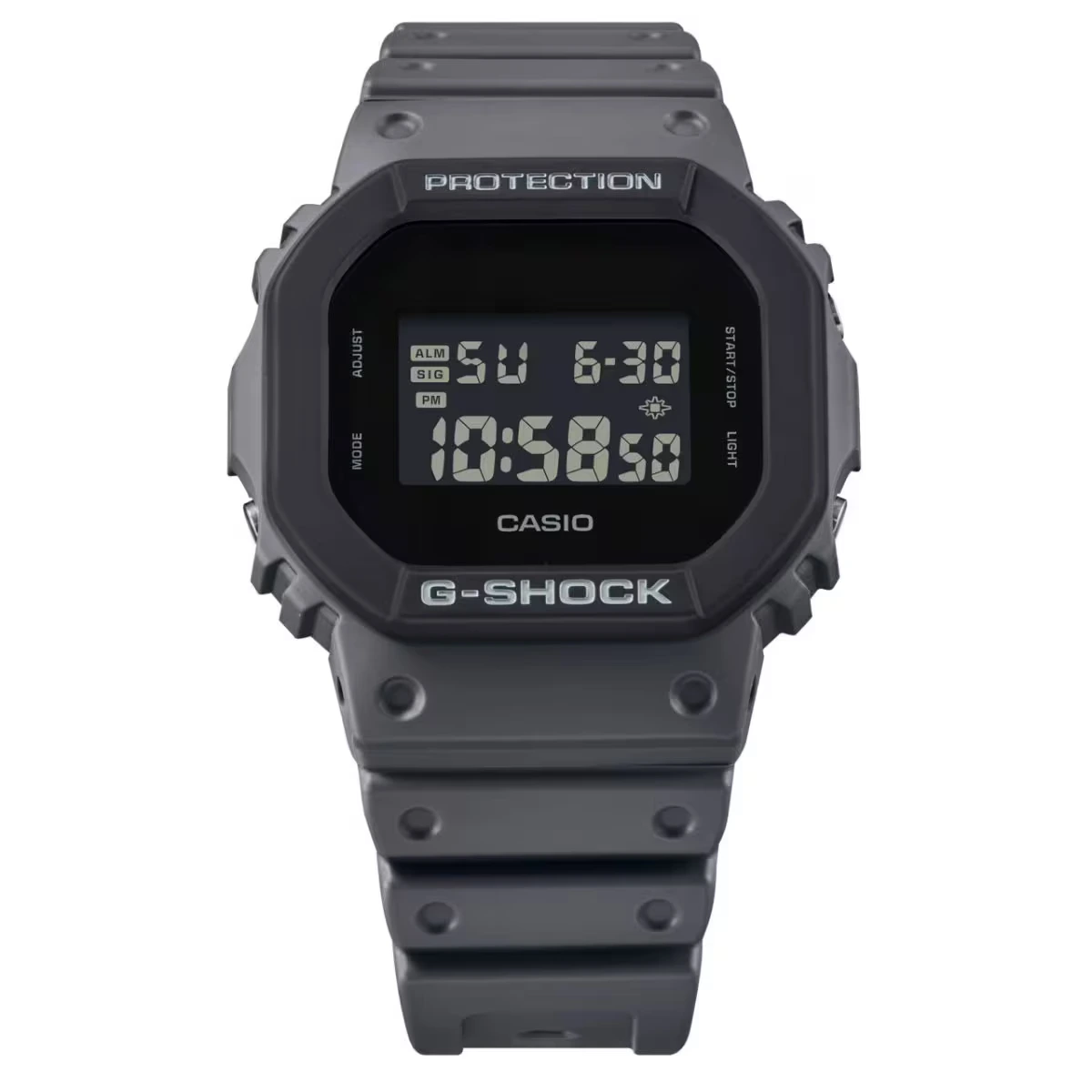 ساعت مچی مردانه G-SHOCK DW-5610UU-8DR بهصورت کاملاً دیجیتال طراحی شده و اطلاعات ضروری را با وضوح بالا نمایش میدهد. صفحه مشکیرنگ در کنار شیشه معدنی مقاوم، خوانایی مناسب و محافظت قابلاعتمادی در برابر خط و خشهای روزمره فراهم میکند. ابعاد استاندارد ساعت (۴۸.۹ × ۴۳.۸ × ۱۳.۵ میلیمتر) باعث میشود این مدل بهخوبی روی مچ دست قرار بگیرد و برای استفاده طولانیمدت کاملاً مناسب باشد. بند رزینی با قفل سگکی ساده نیز امکان تنظیم آسان و فیت شدن دقیق را فراهم میکند.