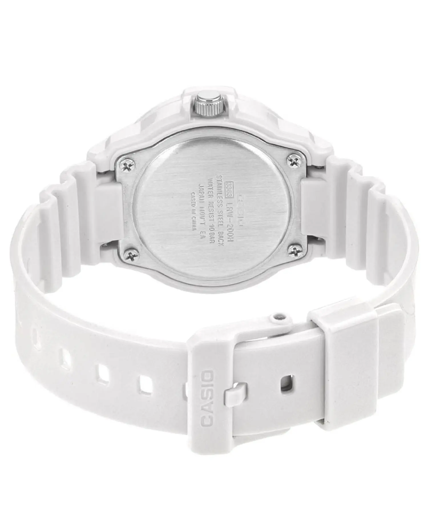 ابعاد ساعت 38.9 × 34.2 × 11.5 میلیمتر بوده و بند رزینی سفید با قفل سگکی، قابلیت تنظیم را برای انواع سایز مچ فراهم میکند. از نظر کاربری نیز با حرکت آنالوگ، خوانایی بالایی ارائه میدهد و با منبع انرژی باتری معمولی نیاز به نگهداری پیچیده ندارد.