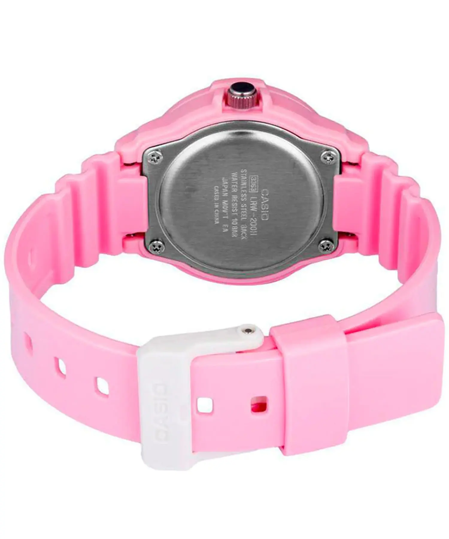 ساعت مچی کاسیو مدل LRW-200H-4E4V یک گزینهی ایدهآل و کاربردی برای کودکان است که هم ظاهر زیبا دارد و هم از نظر کیفیت و دوام کاملاً قابلاعتماد است. این ساعت با ترکیب رنگی صورتی/کالباسی طراحی شده و ظاهری شاد، کودکانه و جذاب ایجاد میکند.
