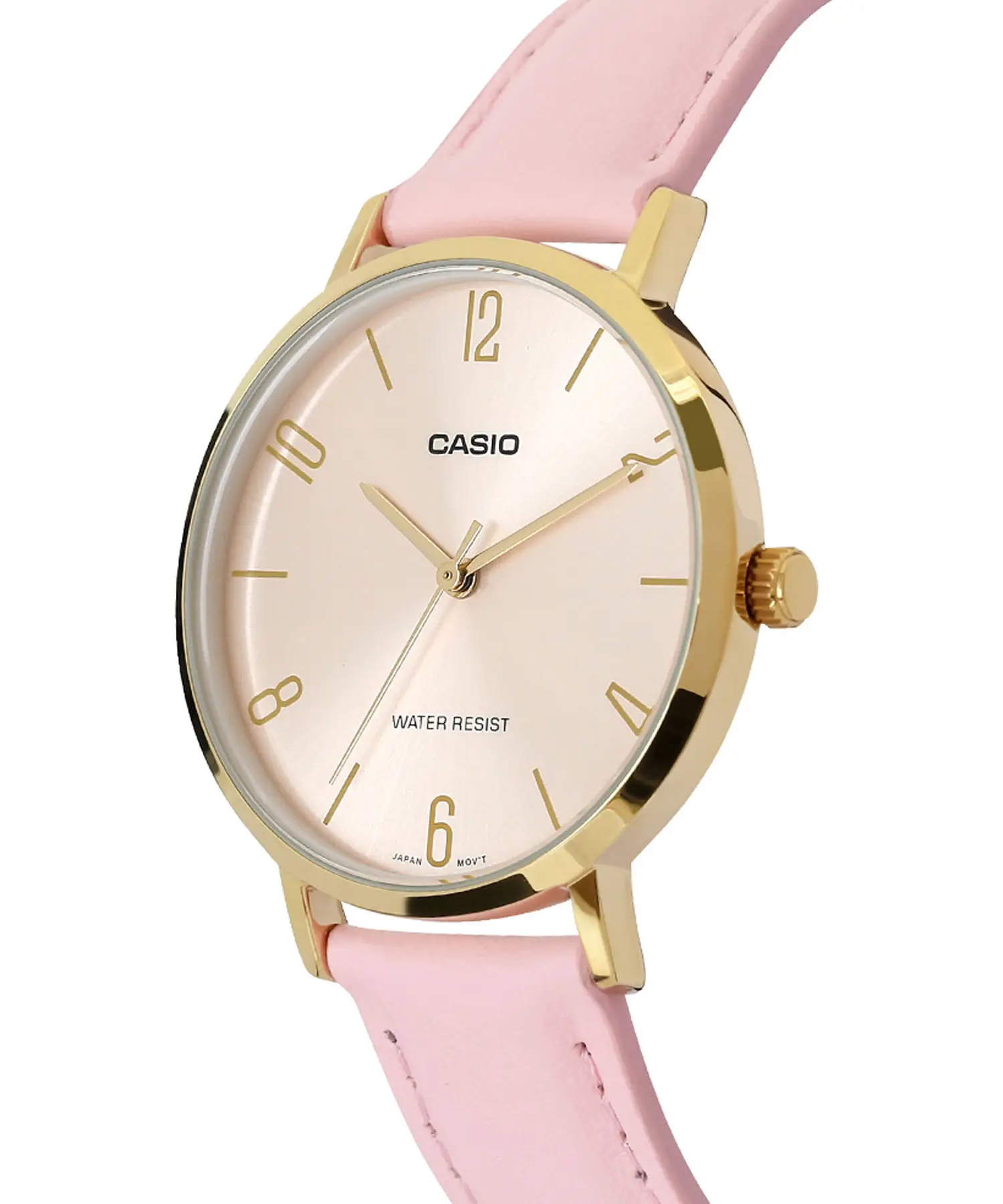 ساعت مچی زنانه کاسیو مدل CASIO LTP-VT01GL-4B یکی از ظریفترین و درعینحال شیکترین انتخابها برای بانوانی است که به دنبال ترکیبی از سادگی، لطافت رنگ و طراحی کلاسیک هستند. این مدل با صفحهی رزگلد ملایم و قاب طلایی، هارمونی رنگی زنانه و جذابی ایجاد میکند؛ هارمونیای که بهخوبی با بند چرمی صورتی/کالباسی هماهنگ شده و شخصیتی گرم، لطیف و کاملاً فمینین به ساعت میبخشد.
