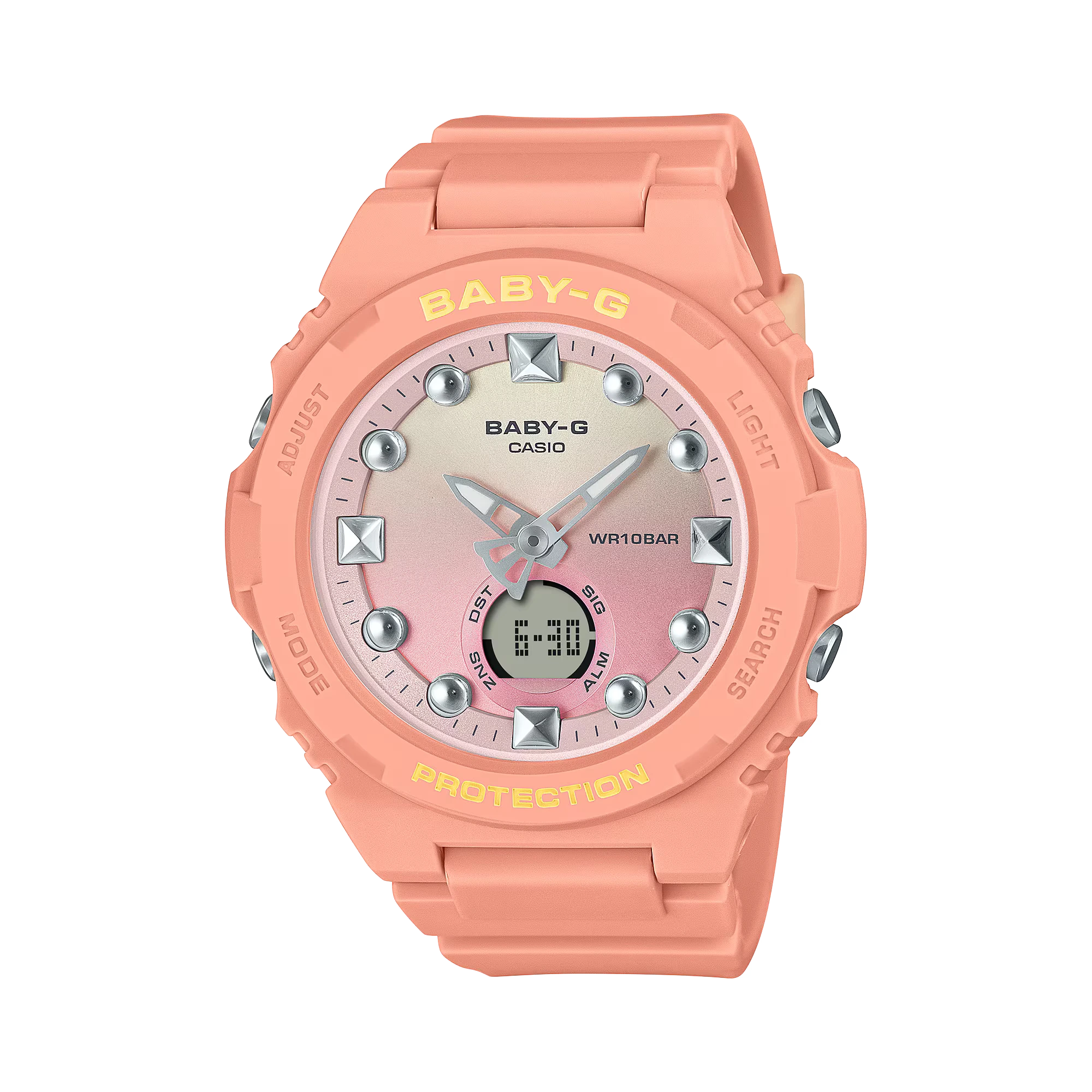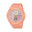 ساعت مچی زنانه BABY-G BGA-320-4A1DR از نمایش ترکیبی آنالوگ و دیجیتال بهره میبرد که هم جلوهای مدرن ایجاد میکند و هم دسترسی سریع به اطلاعات مختلف را فراهم میسازد. صفحه چندرنگ ساعت، هماهنگی کاملی با رنگ بدنه داشته و خوانایی مناسبی در شرایط نوری مختلف ارائه میدهد. بند رزینی نارنجی/گلبهی با قفل سگکی ساده، بهراحتی قابل تنظیم بوده و بهخوبی روی مچ دست فیکس میشود.