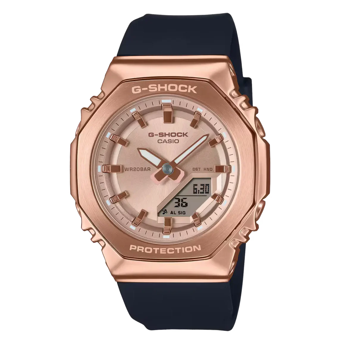 ساعت مچی زنانه کاسیو G-SHOCK مدل GM-S2110PG-1A4DR از برند کاسیو، مناسب برای خانمها طراحی شده و ترکیبی از زیبایی، دوام و عملکرد حرفهای را ارائه میدهد. این ساعت دارای فرم قاب چند ضلعی و جنس قاب استیل ضدزنگ است که ظاهری لوکس و مقاوم به آن میبخشد. رنگ بدنه رزگلد و بند از رزین زیستپایه، جلوهای مدرن و شیک به ساعت داده و با انواع استایلهای روزمره و رسمی هماهنگ است.