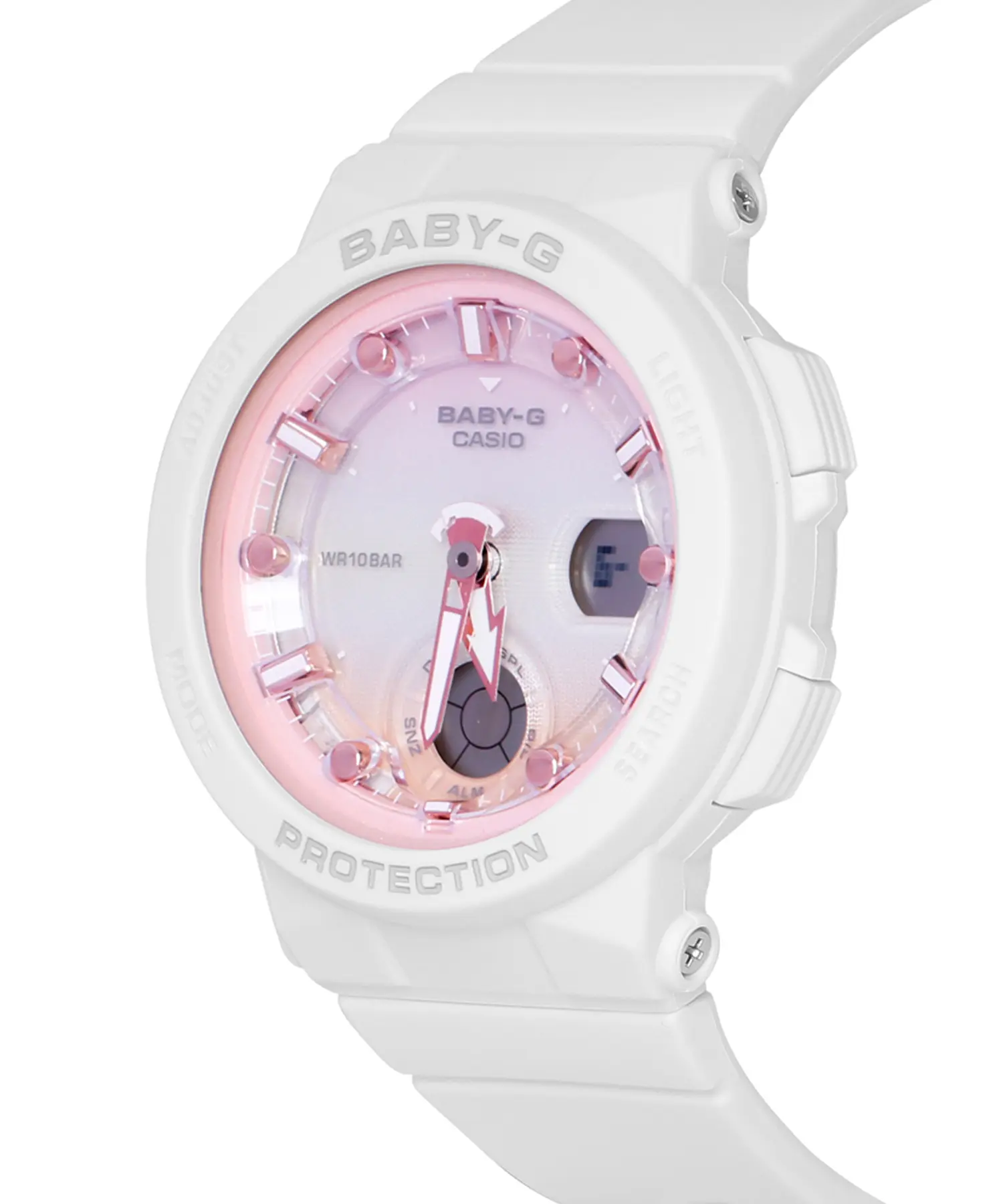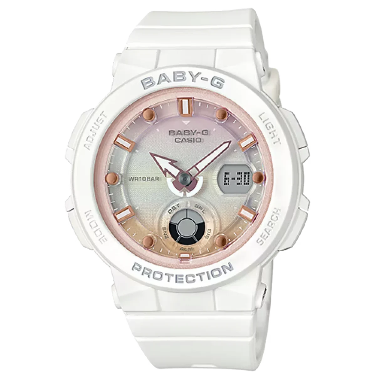 طراحی ظاهری این مدل حس شادابی و طراوت را منتقل میکند و در عین سادگی، کاملاً بهروز و هماهنگ با ترندهای ساعت زنانه است. برند کاسیو (CASIO) در این مدل نیز همان کیفیت همیشگی را حفظ کرده و Baby-G BGA-250-7A2 را به گزینهای مطمئن برای استفاده طولانیمدت تبدیل کرده است. این ساعت انتخابی مناسب برای خانمهایی است که به دنبال ساعت مچی زنانه اسپرت، بادوام و اصل کاسیو هستند و میخواهند در کنار زیبایی، از اعتبار یک برند جهانی بهره ببرند.