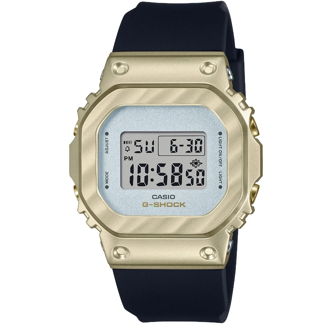 ساعت زنانه G-SHOCK مدل GM-S5600BC-1DR یکی از جذاب‌ترین گزینه‌های سری زنانه جی‌شاک است که ظاهر طلایی لوکس را با دوام و مقاومت همیشگی این برند ترکیب می‌کند. طراحی قاب مربع–مستطیل که امضای مدل‌های کلاسیک 5600 است، در این نسخه با فریم استیل طلایی و بدنه‌ی رزین و استیل بازطراحی شده و ظاهری مدرن، ظریف و درعین‌حال قدرتمند ایجاد کرده است. بند رزینی مشکی علاوه بر وزن سبک، حس راحتی را هنگام استفاده طولانی‌مدت فراهم می‌کند؛ به‌طوریکه کل ساعت تنها ۵۰ گرم وزن دارد و روی دست بسیار خوش‌نشست است.