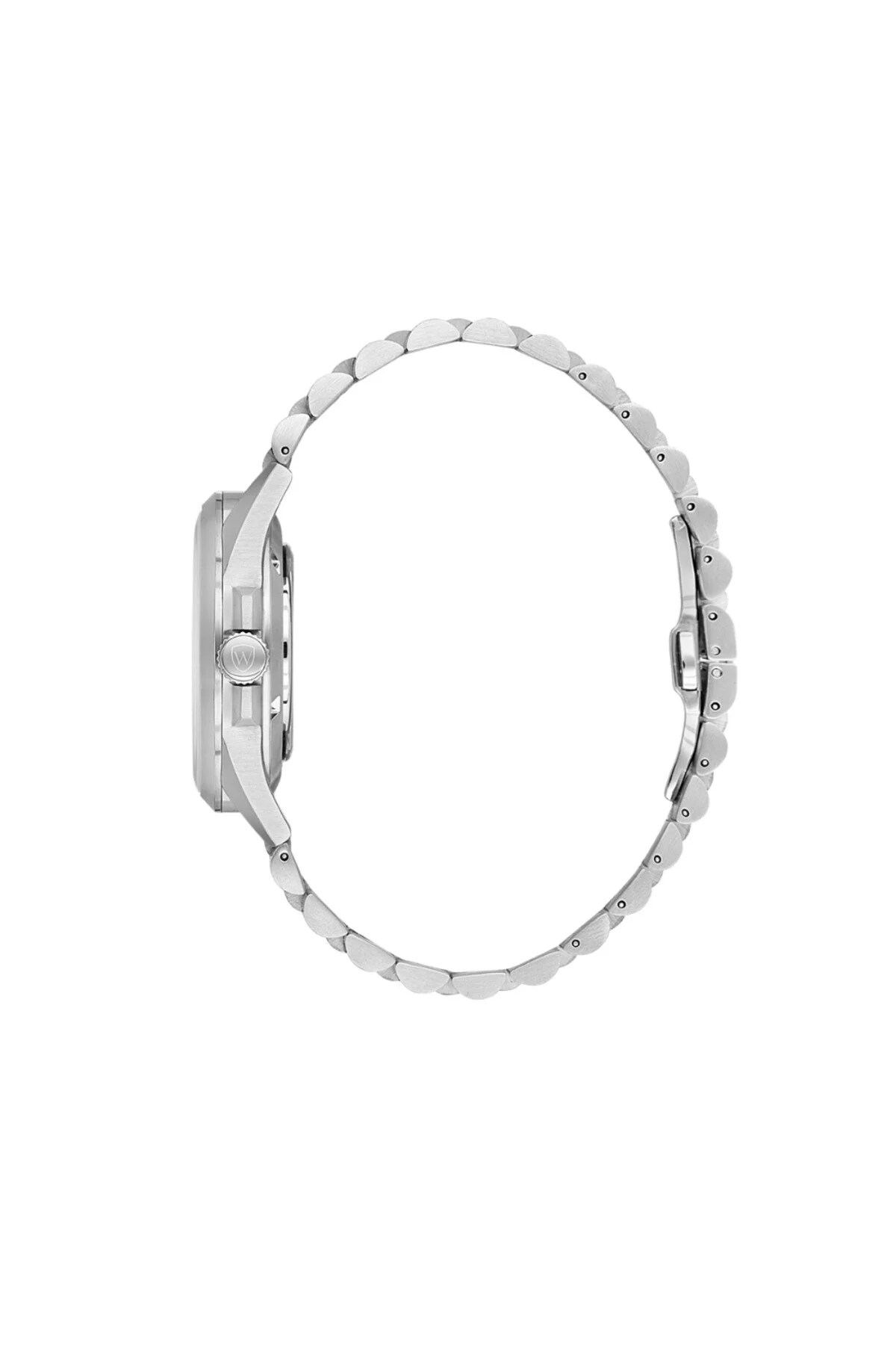 از منظر طراحی، صفحه نقره‌ای رنگ با فرم گرد جلوه‌ای بسیار شفاف، کلاسیک و لوکس ایجاد کرده است. این رنگ صفحه باعث افزایش خوانایی عقربه‌ها شده و حس وقار و سادگی اشرافی را به ساعت می‌بخشد. هماهنگی کامل صفحه با بدنه و بند استیل نقره‌ای، ظاهری یکدست و حرفه‌ای خلق کرده که به‌راحتی با کت‌وشلوار رسمی، پوشش اداری و استایل‌های کلاسیک هماهنگ می‌شود. بند استیل این مدل به قفل ضامن‌دار (کلیپسی) مجهز شده که ضمن امنیت بالا، راحتی مطلوبی را در استفاده روزمره فراهم می‌کند.