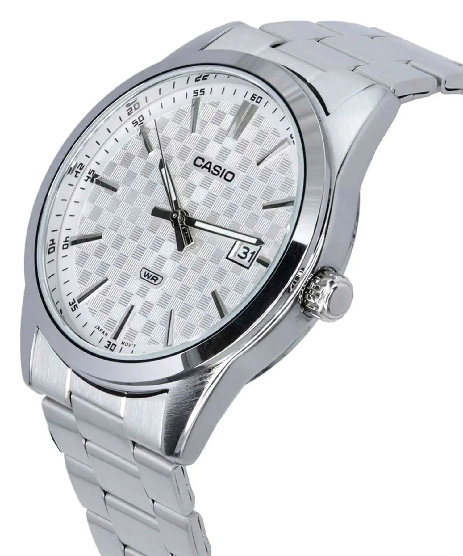 ساعت مچی مردانه CASIO مدل MTP-VD03D-7AUDF انتخابی شیک و کاربردی برای آقایانی است که به دنبال طراحی کلاسیک، بدنه استیل ضدزنگ و کیفیت قابلاعتماد هستند. این ساعت با نمایشگر آنالوگ دقیق با موتور کوارتز و منبع انرژی باتری معمولی، کارکردی پایدار و طولانیمدت ارائه میدهد. بدنه و بند از جنس استیل ضدزنگ با رنگ نقرهای براق بوده و در کنار شیشه معدنی مقاوم در برابر خط و خشهای سطحی، ظاهری حرفهای و رسمی ایجاد میکند. صفحه ساعت در رنگهای خاکستری یا نقرهای طراحی شده و با اندکسهای ساده و خوانا، جلوهای مینیمال و جذاب دارد.