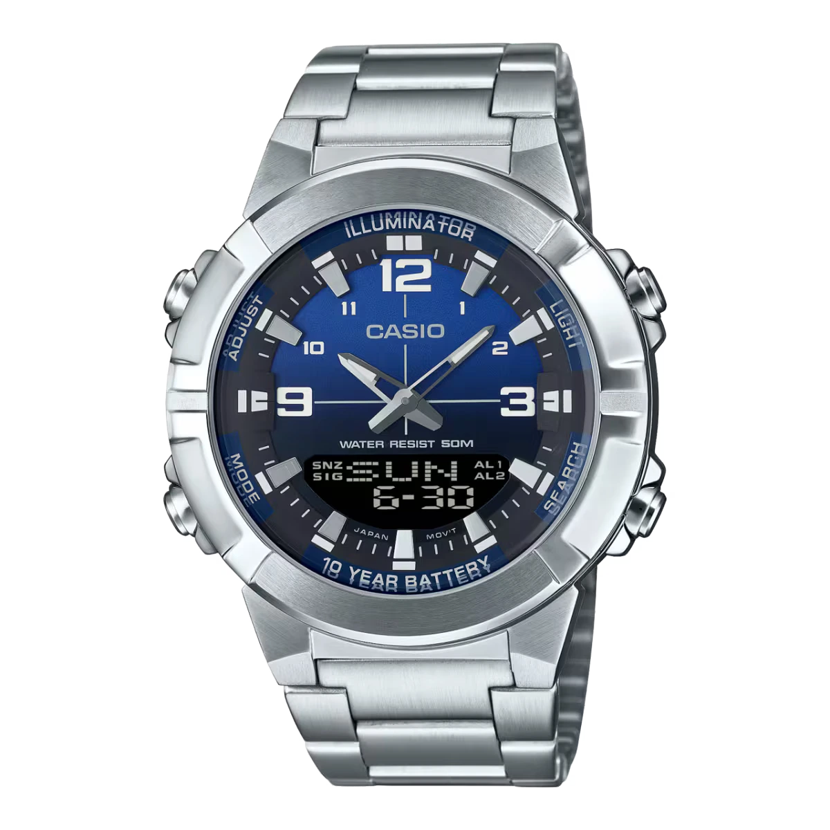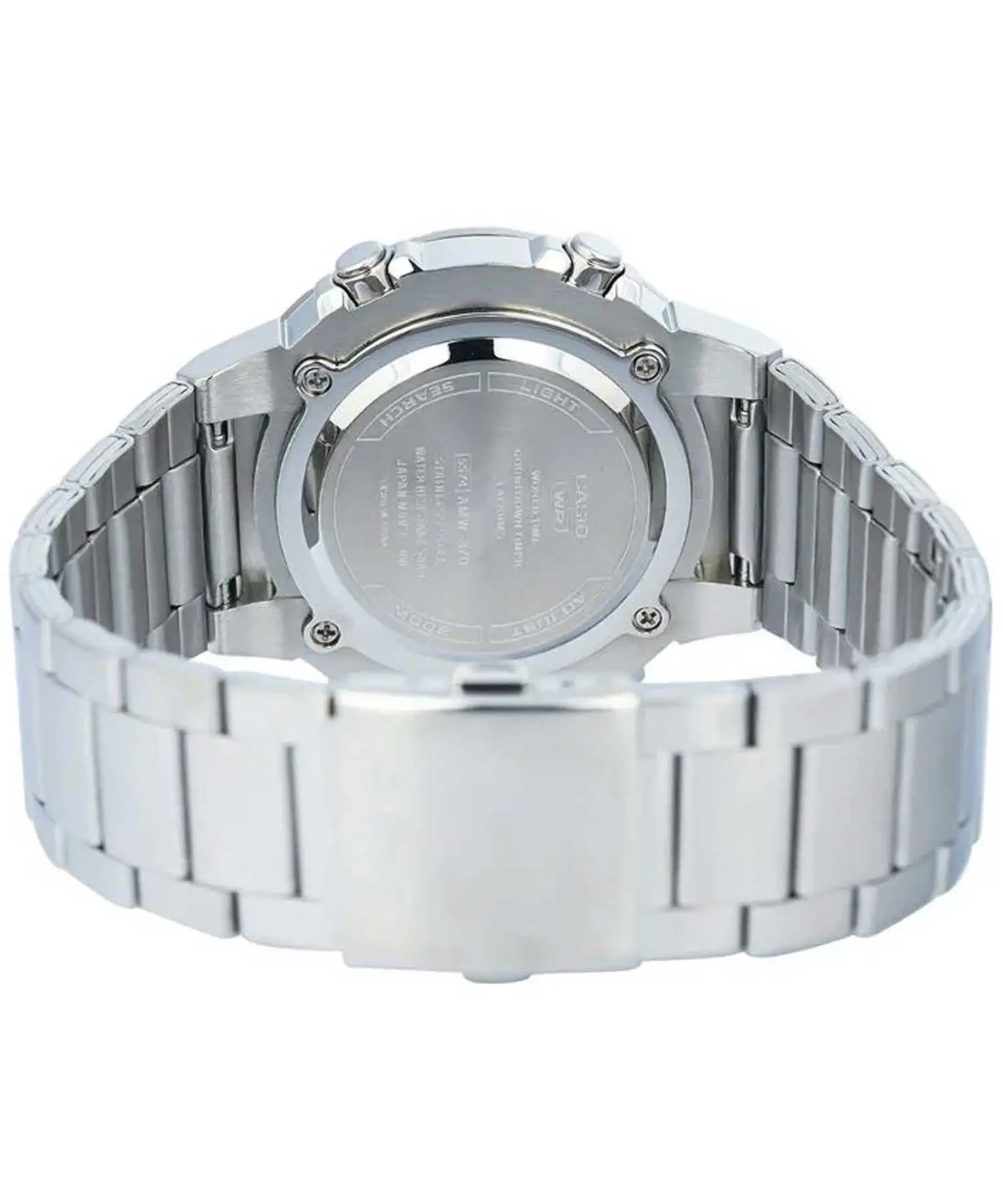 بدنه و قاب این ساعت از استیل ضدزنگ نقرهای ساخته شده که علاوه بر ظاهر براق و حرفهای، مقاومت بالایی در برابر ضربههای سطحی و فرسایش روزمره دارد. فرم قاب گرد در کنار ابعاد متعادل ساعت (۵۱.۵ × ۴۴ × ۱۲.۳ میلیمتر)، باعث شده AMW-870DA-2A1VDF حضوری قدرتمند اما متعادل روی مچ دست داشته باشد. بند استیل ضدزنگ با قفل کلیپسی ضامندار، ایمنی بالا و راحتی در باز و بسته شدن را فراهم میکند و برای استفاده طولانیمدت گزینهای مطمئن به شمار میرود.