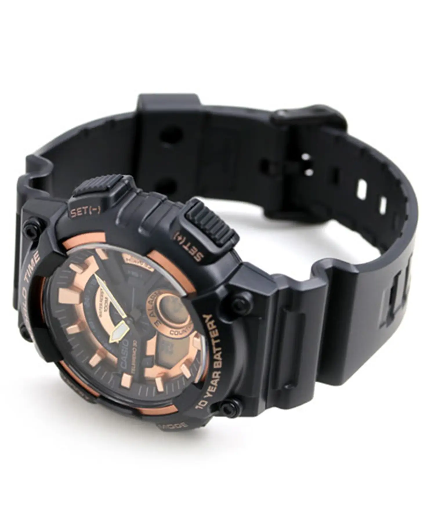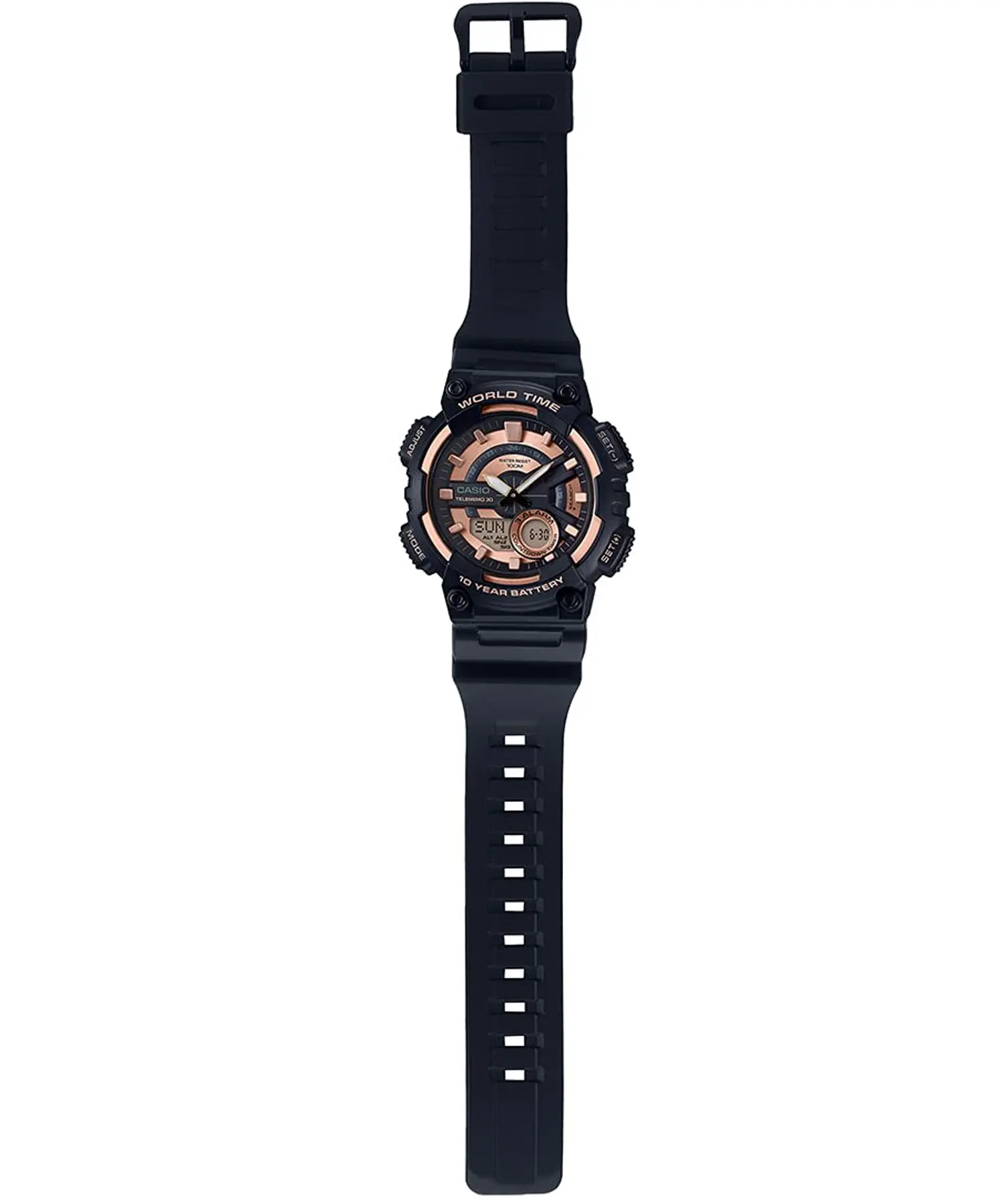 ساعت مچی CASIO AEQ-110W-1A3 یکی از مدلهای جذاب و پرفروش کاسیوست که با ترکیب نمایشگر آنالوگ و دیجیتال و استفاده از جزئیات رزگلد روی صفحه و قاب، ظاهری شیکتر و چشمگیرتر نسبت به مدلهای اسپرت معمول ارائه میدهد. این ساعت با بدنه و بند رزینی مقاوم در رنگ مشکی / دودی تیره ساخته شده و در عین استحکام بالا، وزن بسیار مناسب ۴۹ گرم دارد تا روی مچ کاملاً راحت و قابل استفاده روزانه باشد.