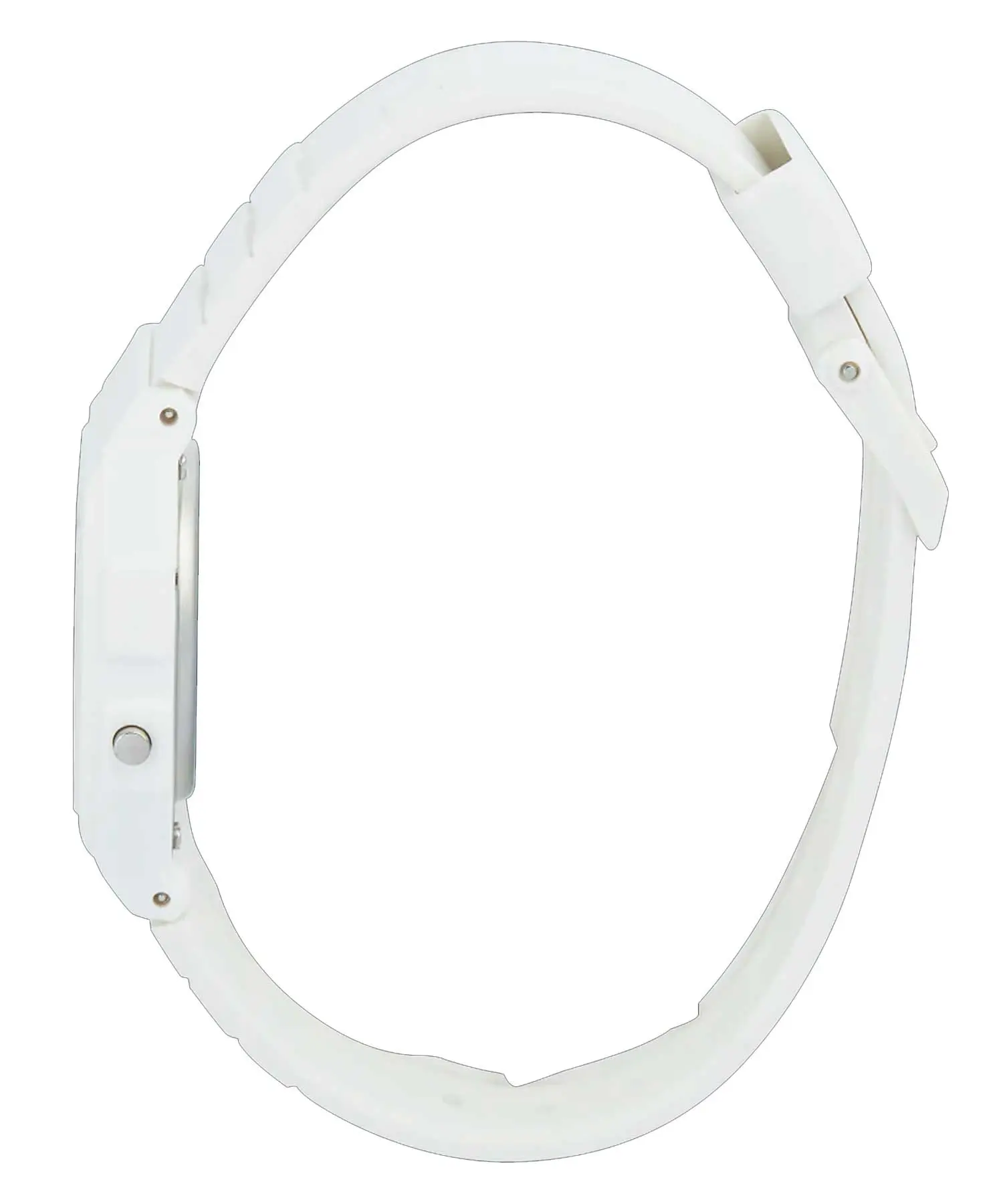 ساختار قاب با فرم مربع/مستطیل کلاسیک و جنس رزین مقاوم طراحی شده که علاوه بر دوام بالا، ظاهری اسپرت و جوانپسند دارد. بند ساعت نیز از جنس رزین سفید رنگ با قفل سگکی بوده که قابلیت تنظیم مناسب برای انواع مچ دست را فراهم میکند. صفحه دیجیتال با رنگ خاکستری/طوسی نمایش زمان، تقویم، آلارم، کرنومتر و چراغ پسزمینه را به صورت خوانا و دقیق ارائه میدهد.