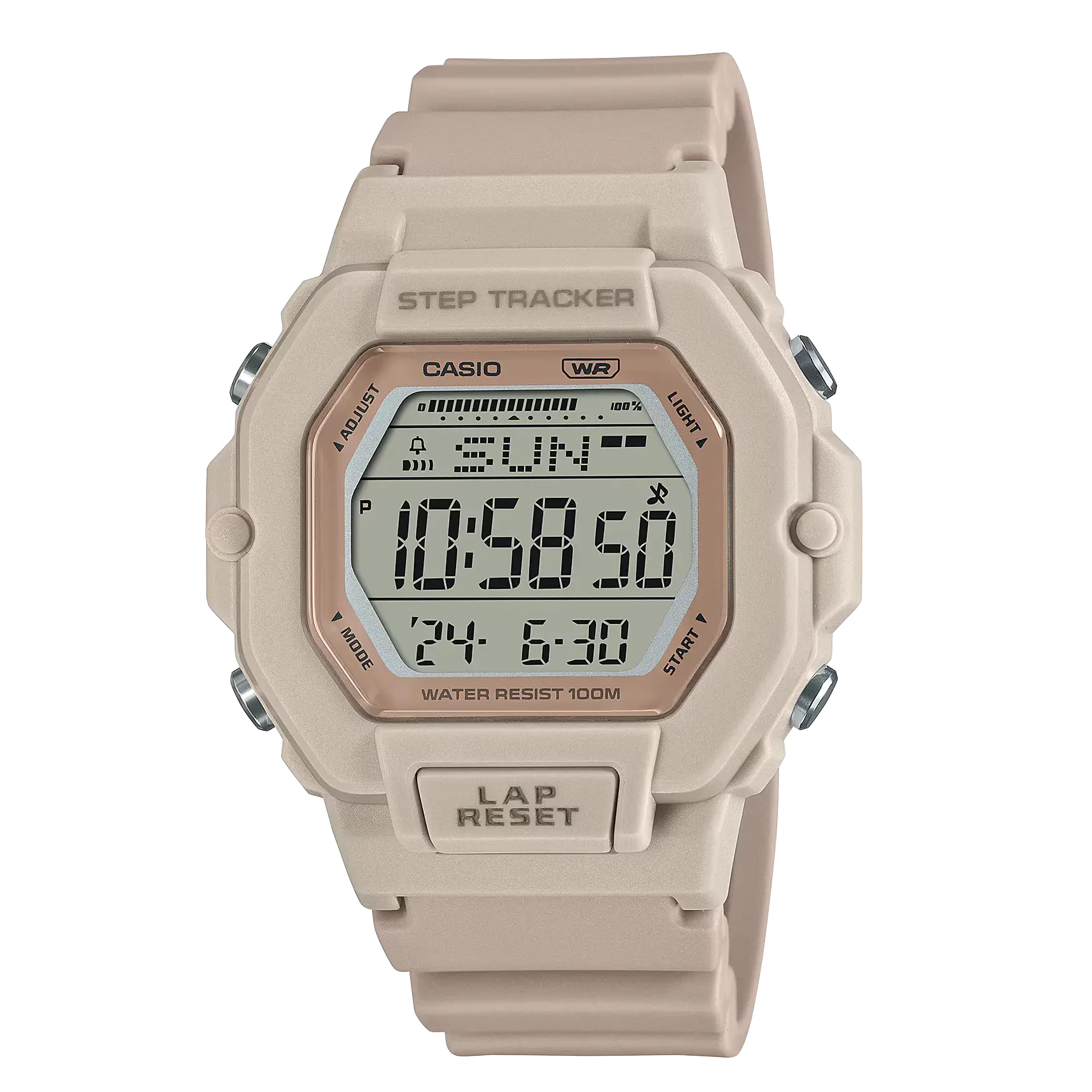 بدنه و بند این ساعت از رزین مقاوم ساخته شده که علاوه بر وزن بسیار سبک (فقط 29 گرم)، در برابر ضربه و استفاده روزمره دوام بالایی دارد. ترکیب رنگی جذاب کرم/بژ با جزئیاتی در طیف قهوهای مایل به مسی، ظاهری مدرن و چشمنواز ایجاد کرده و آن را از مدلهای معمولی متمایز میکند.