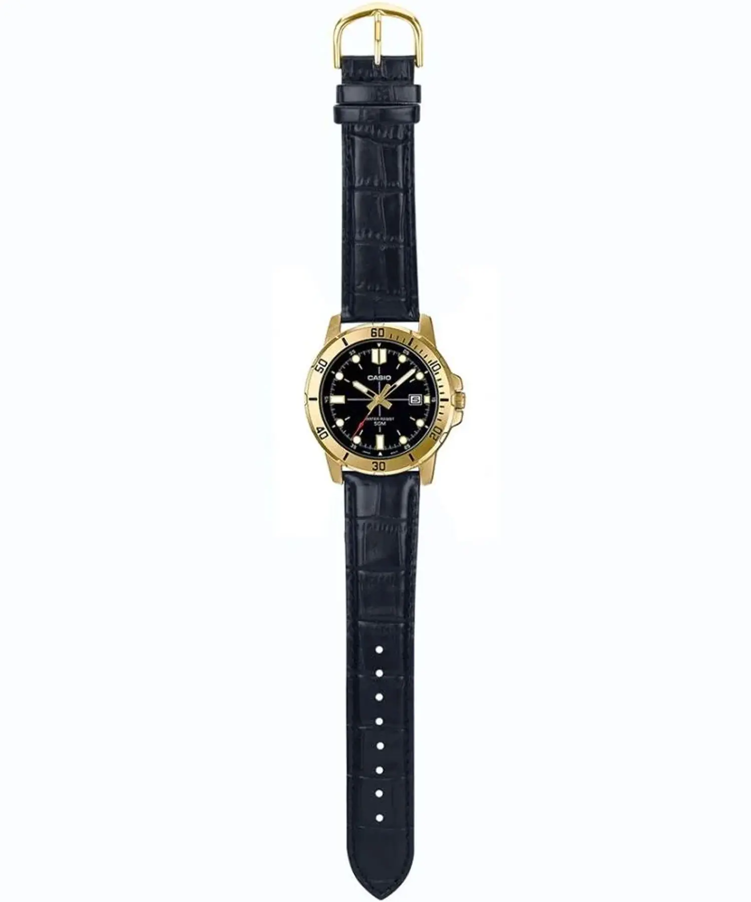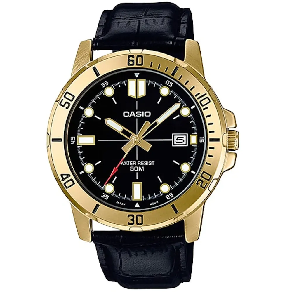 CASIO-MTP-VD01GL-1EV یکی از مدلهای چشمگیر و شیک کاسیو است که با ترکیب قاب طلایی و صفحهی مشکی، ظاهری کاملاً لوکس، رسمی و جذاب ایجاد میکند. این مدل برای آقایانی طراحی شده که دوست دارند ساعتشان علاوه بر سادگی، جلوهای سنگین و باکلاس داشته باشد.
