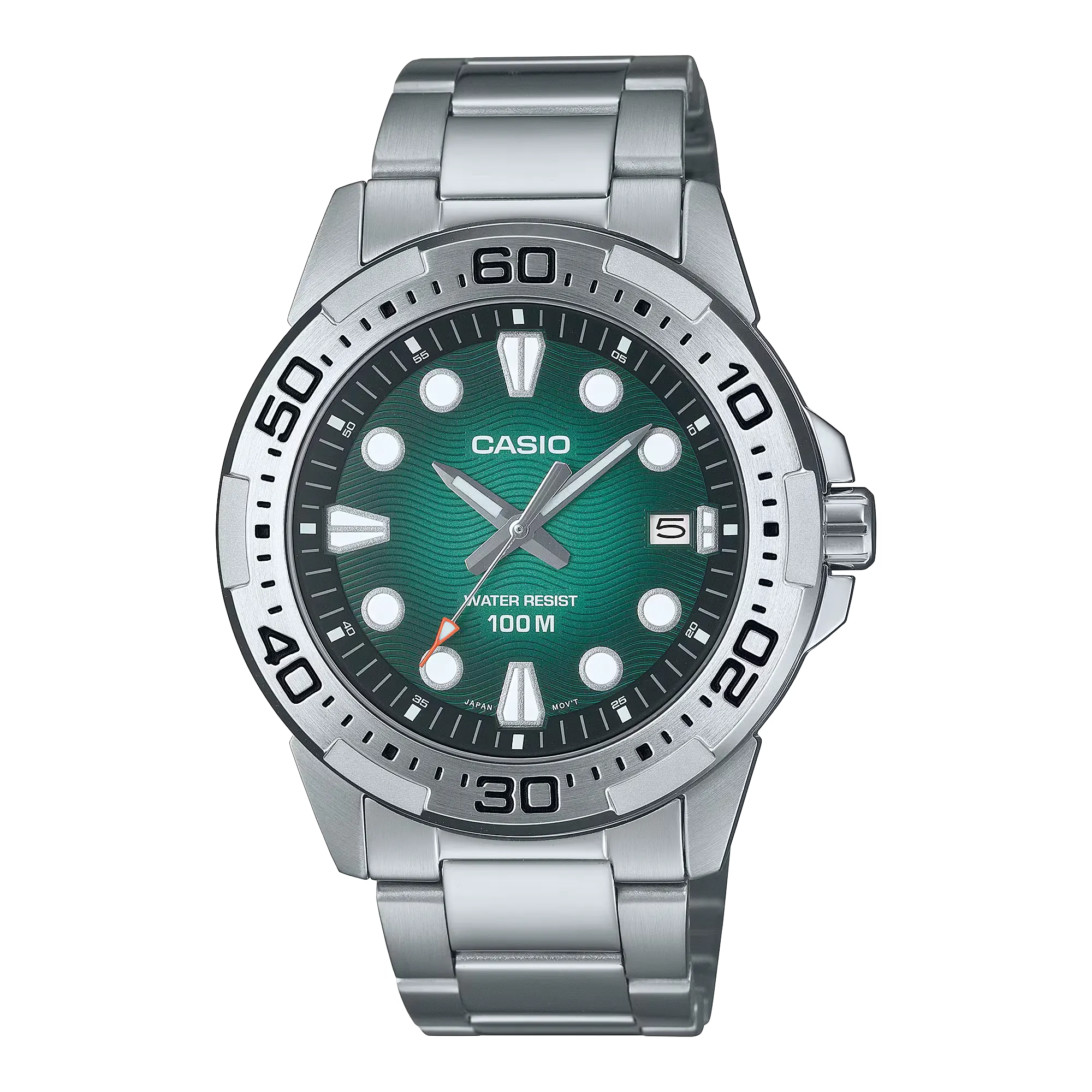 ساعت مچی مردانه کاسیو مدل MTD-140D-3A انتخابی شیک و مقاوم برای آقایانی است که به ساعتی قابلاعتماد با طراحی کلاسیک و جلوهای مدرن نیاز دارند. این مدل از سری CASIO با ترکیب بدنه و بند استیل نقرهای در کنار صفحه سبز جذاب، ظاهری خاص و متفاوت ایجاد کرده که هم برای استفاده روزمره و هم برای استایل رسمی و نیمهرسمی کاملاً مناسب است.
