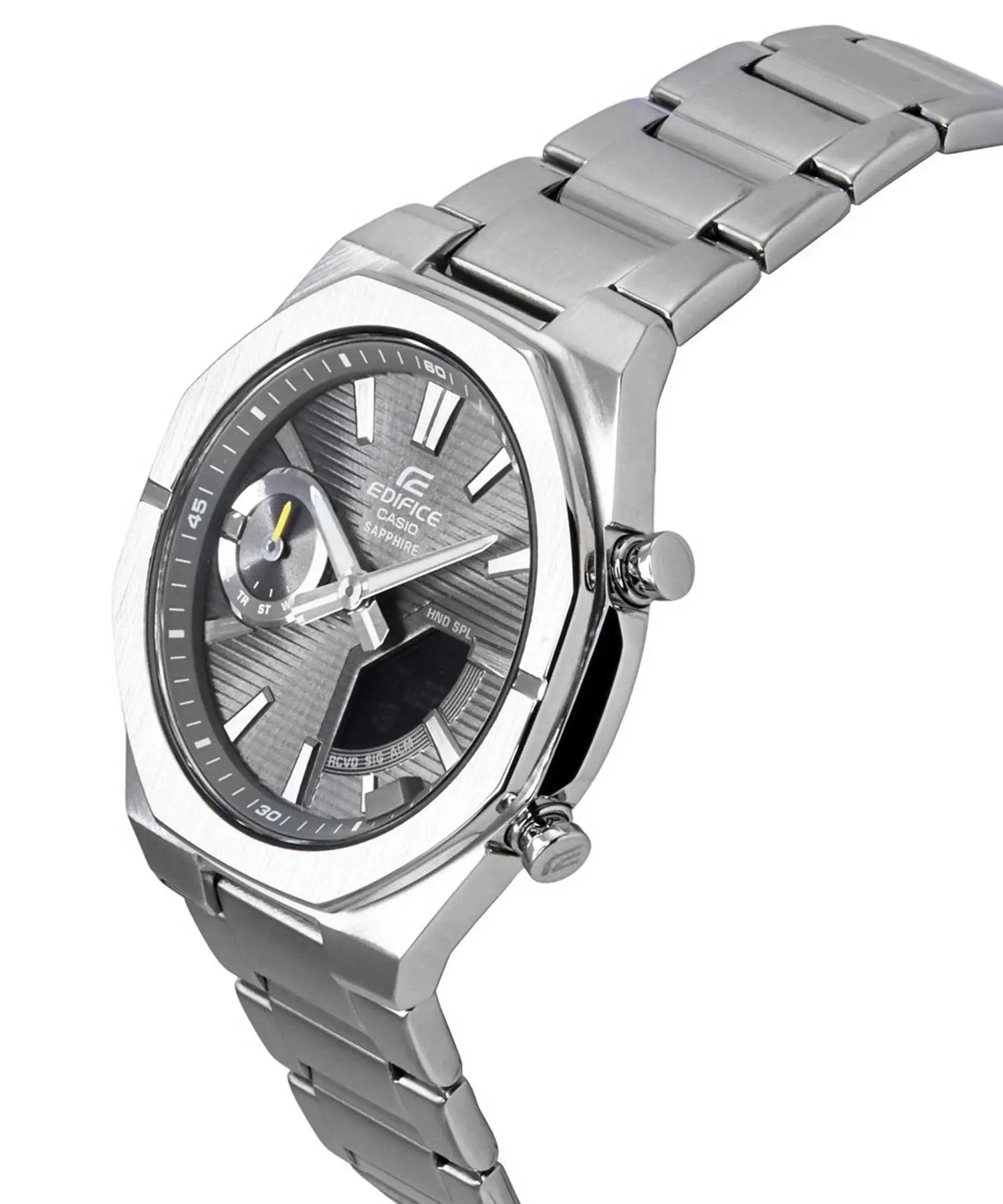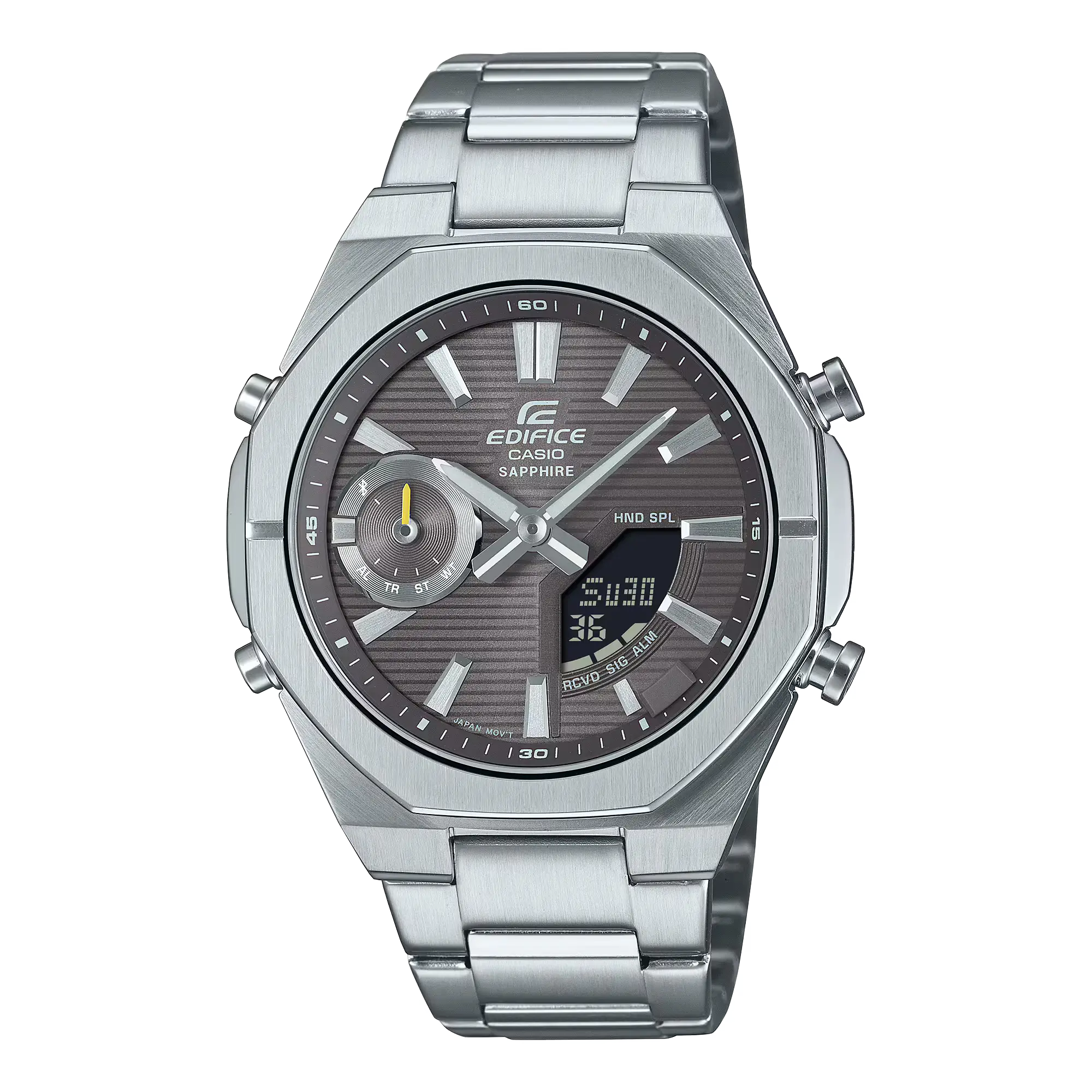 قاب چندضلعی این ساعت از استیل ضدزنگ نقرهای ساخته شده که علاوه بر استحکام بالا، جلوهای مدرن و خاص به ساعت میبخشد. طراحی زاویهدار قاب در کنار ضخامت باریک 9.6 میلیمتری، باعث شده ECB-S10D-8ADF روی مچ دست بسیار خوشفرم و متعادل قرار بگیرد و حس یک ساعت مدرن و حرفهای را منتقل کند. صفحه سبز رنگ ساعت، یکی از شاخصترین عناصر طراحی آن محسوب میشود که در ترکیب با قاب و بند نقرهای، کنتراستی شیک، متفاوت و چشمنواز ایجاد میکند. استفاده از شیشه کریستال یاقوت کبود (Sapphire Crystal) نیز مقاومت فوقالعادهای در برابر خطوخش فراهم کرده و این مدل را در سطح ساعتهای ردهبالای EDIFICE قرار میدهد.