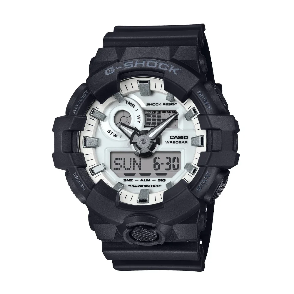 ساعت مچی مردانه کاسیو G-SHOCK مدل GA-700WD-1ADR یکی از گزینههای قدرتمند و بادوام سری جیشاک است که برای استفاده روزمره، فعالیتهای ورزشی و شرایط سخت طراحی شده است. این مدل با بدنهای از جنس رزین مقاوم و ساختار مستحکم ضدضربه، دوام بالایی را در محیطهای مختلف تضمین میکند. ترکیب نمایشگر آنالوگ و دیجیتال باعث شده خوانایی بالا و کاربری سریع در هر شرایط نوری فراهم شود. بدنه و بند به رنگ مشکی / دودی تیره طراحی شده و ظاهر اسپرت، جسور و مردانهای به ساعت میدهد. صفحه سفید با عقربهها و جزئیات کنتراستدار، جلوهای مدرن و اثرگذار ایجاد میکند و استفاده طولانیمدت از آن بدون خستگی چشم امکانپذیر است. این ساعت همانند دیگر مدلهای سری G-SHOCK دارای مقاومت در برابر آب تا 200 متر است و بدون نگرانی در استخر، باشگاه یا فعالیتهای فضای باز قابل استفاده میباشد. منبع انرژی ساعت باتری معمولی است و مصرف بهینه آن باعث دوام طولانیمدت باتری میشود. ابعاد بزرگ و حجیم ساعت در اندازه 53.4 میلیمتر عرض و 18.5 میلیمتر ضخامت، ظاهر قدرتمند و کلاسیک سری GA-700 را بهخوبی نمایش میدهد. شیشه معدنی در برابر خطوخش مقاومت قابلقبولی دارد و بند رزینی انعطافپذیر، راحتی فوقالعادهای روی مچ ایجاد میکند. نوع قفل سگکی ساده است که ضمن استحکام، استفاده سریع و مطمئن را ممکن میسازد. وزن حدود 72 گرم نیز با وجود ظاهر حجیم، تعادل خوبی روی دست ایجاد کرده و باعث راحتی در استفاده طولانیمدت میشود. این مدل انتخابی عالی برای آقایانی است که به دنبال یک ساعت اسپرت، مقاوم و کاربردی با طراحی شاخص و اصیل جیشاک هستند.