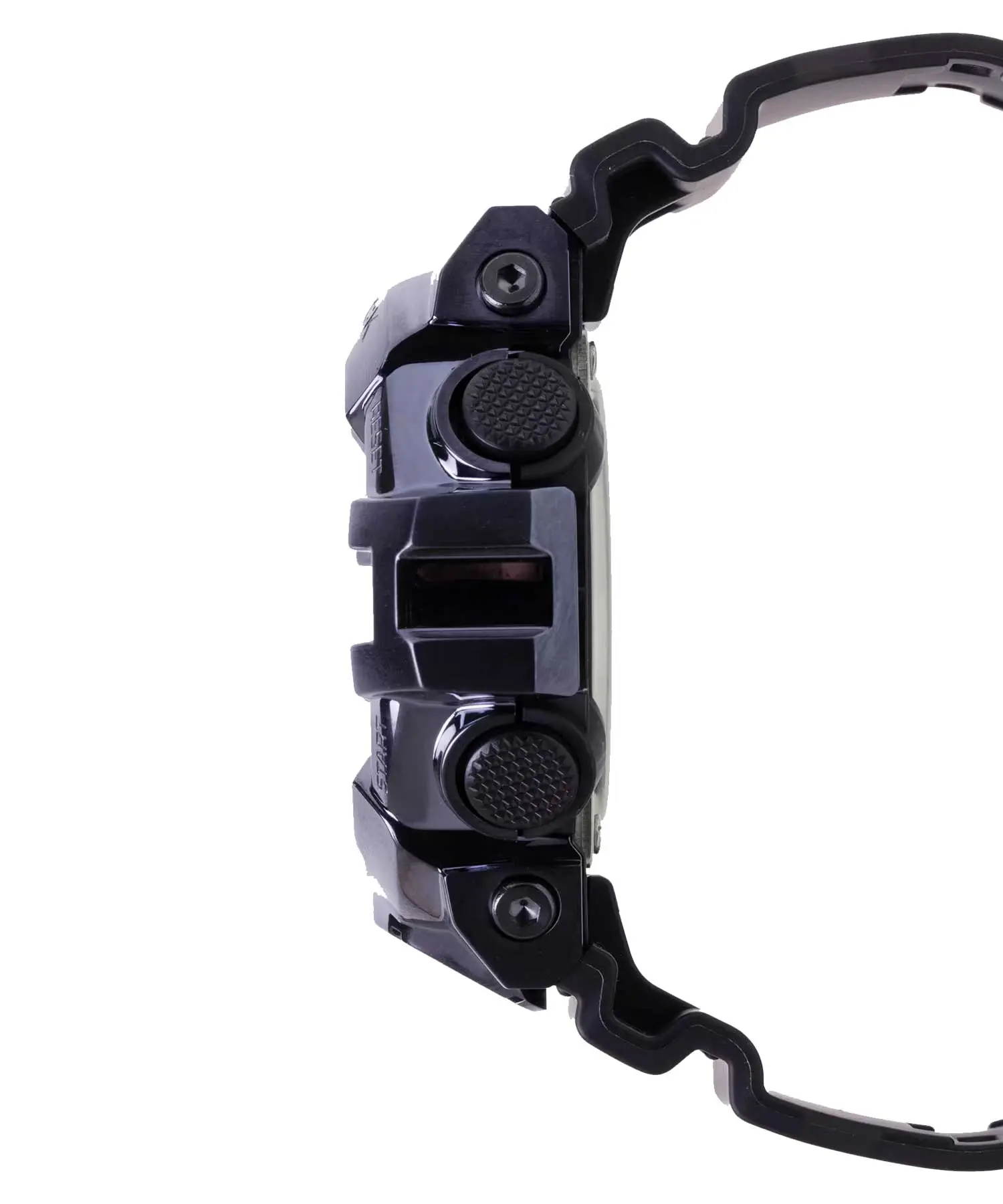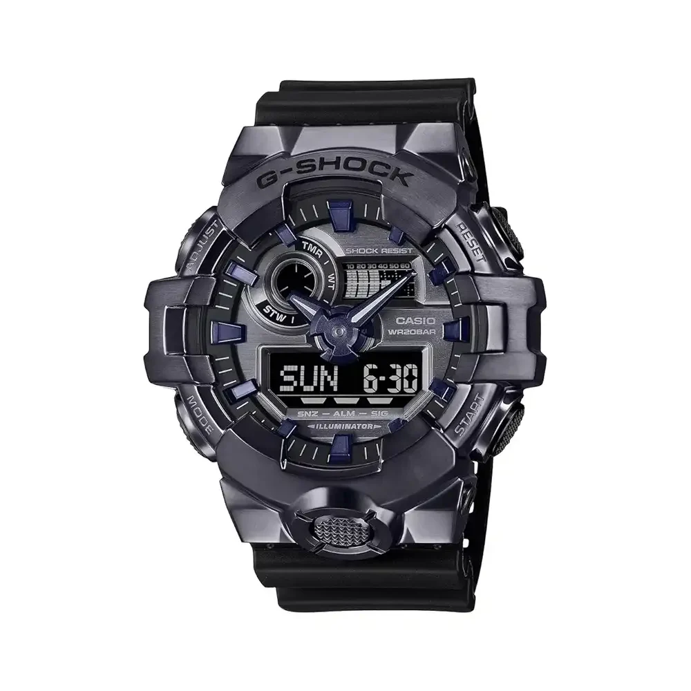 بدنه این ساعت از رزین زیستپایه (Bio-based Resin) ساخته شده که علاوه بر کاهش وزن، دوام و انعطافپذیری بالایی دارد. در کنار آن، قاب استیل ضدزنگ با پوشش بنفش، جلوهای صنعتی و لوکس به ساعت بخشیده و مقاومت آن را در برابر ضربه و فشار افزایش داده است. فرم قاب گرد و ابعاد نسبتاً بزرگ ساعت (۵۸.۴ × ۵۳.۴ × ۱۸.۶ میلیمتر) باعث میشود GM-700P-6ADR حضوری قدرتمند روی مچ دست داشته باشد و برای علاقهمندان به ساعتهای بولد و مردانه انتخابی ایدهآل باشد.