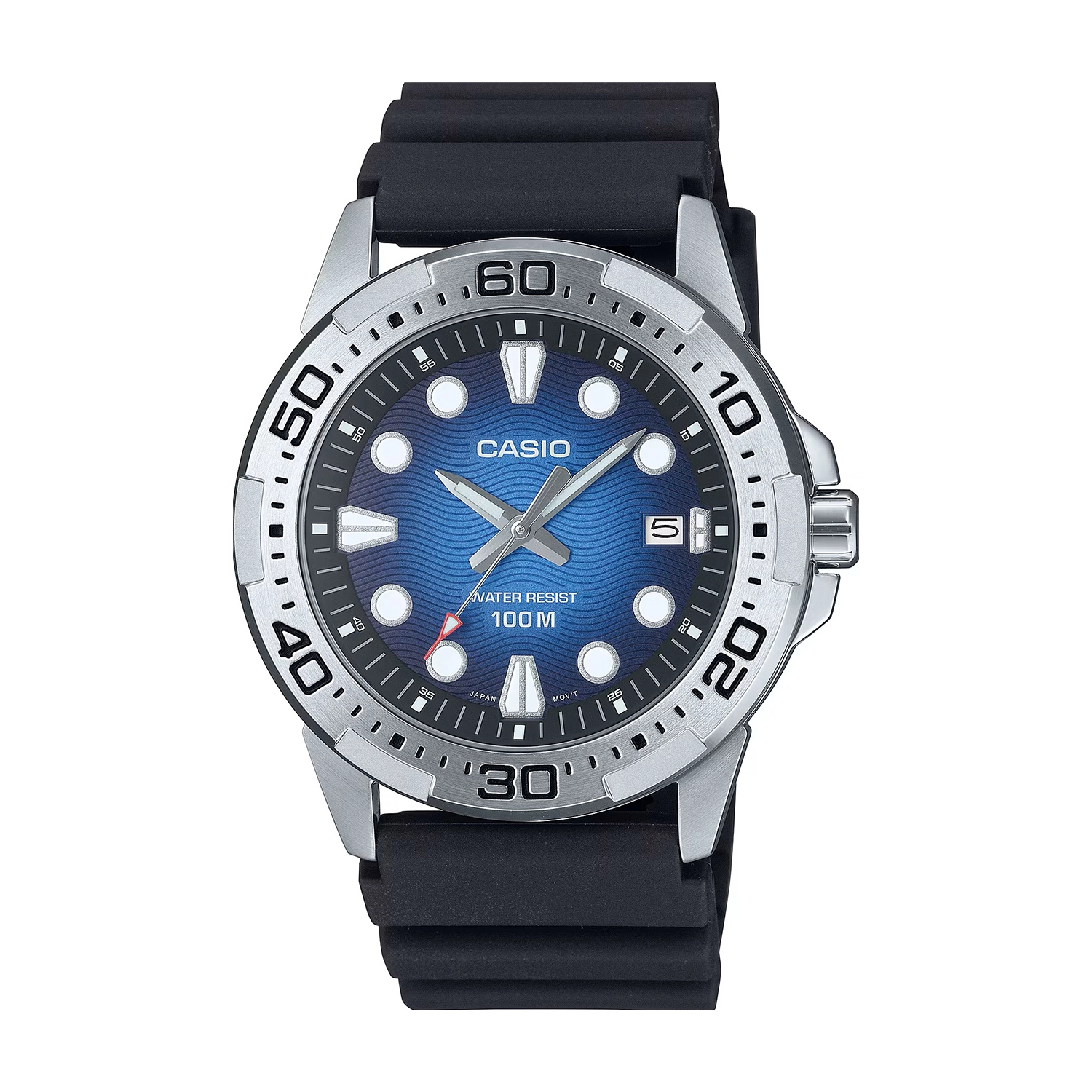 صفحهی ساعت با رنگ آبی طراحی شده که در ترکیب با قاب نقرهای، ظاهری مدرن و چشمگیر را به وجود آورده است. بند رزینی با رنگ مشکی، وزن سبک و راحتی بیشتر را برای استفاده طولانیمدت فراهم میکند و با قفل سگکی ساده بهراحتی روی دست تنظیم میشود.