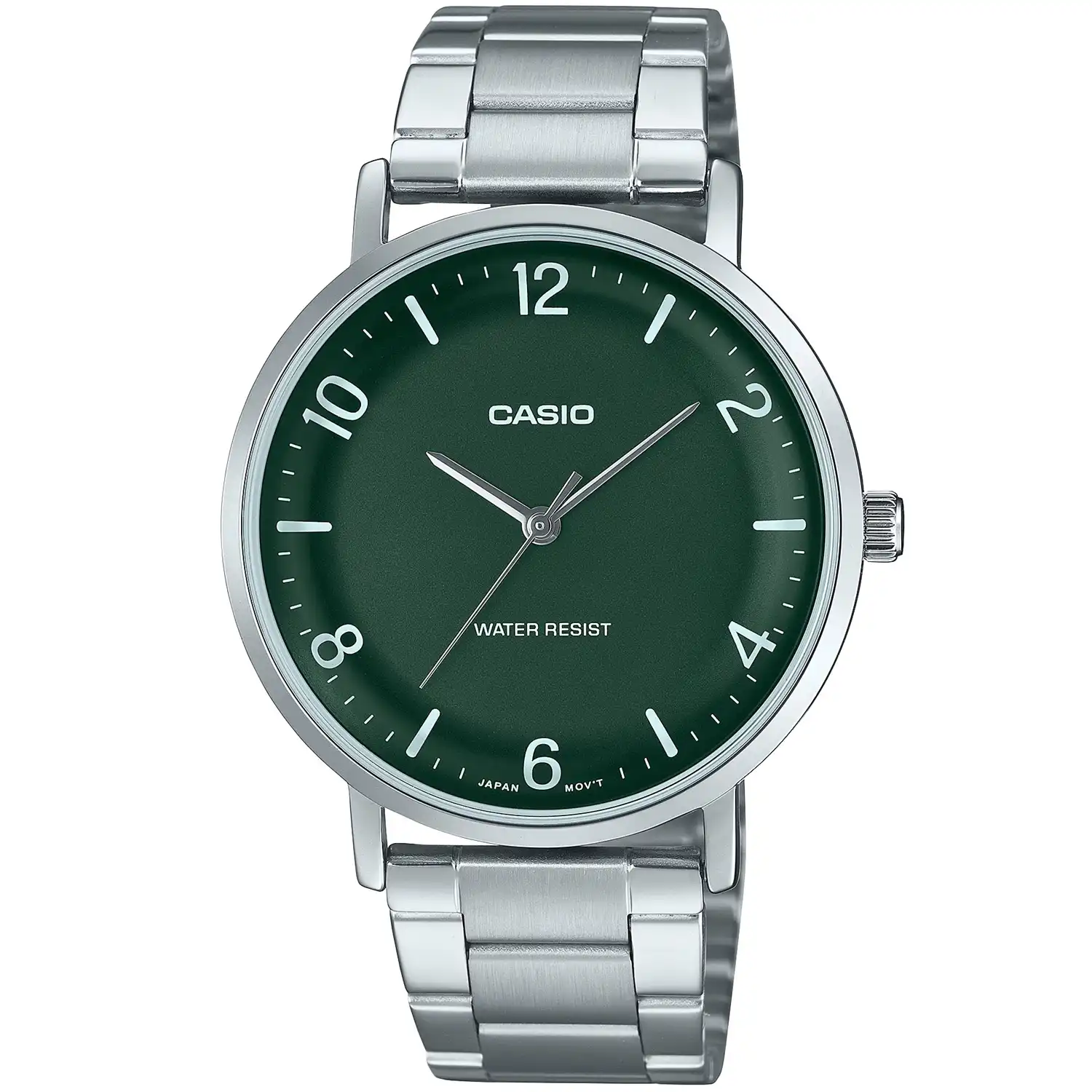 صفحهی سبز این مدل با طراحی ساده و شیک، خوانایی بالایی دارد و در کنار قاب نقرهای، جلوهای متفاوت و جذاب به ساعت میبخشد. شیشهی معدنی مقاومت مناسبی در برابر خطوخشهای روزمره ارائه میدهد.