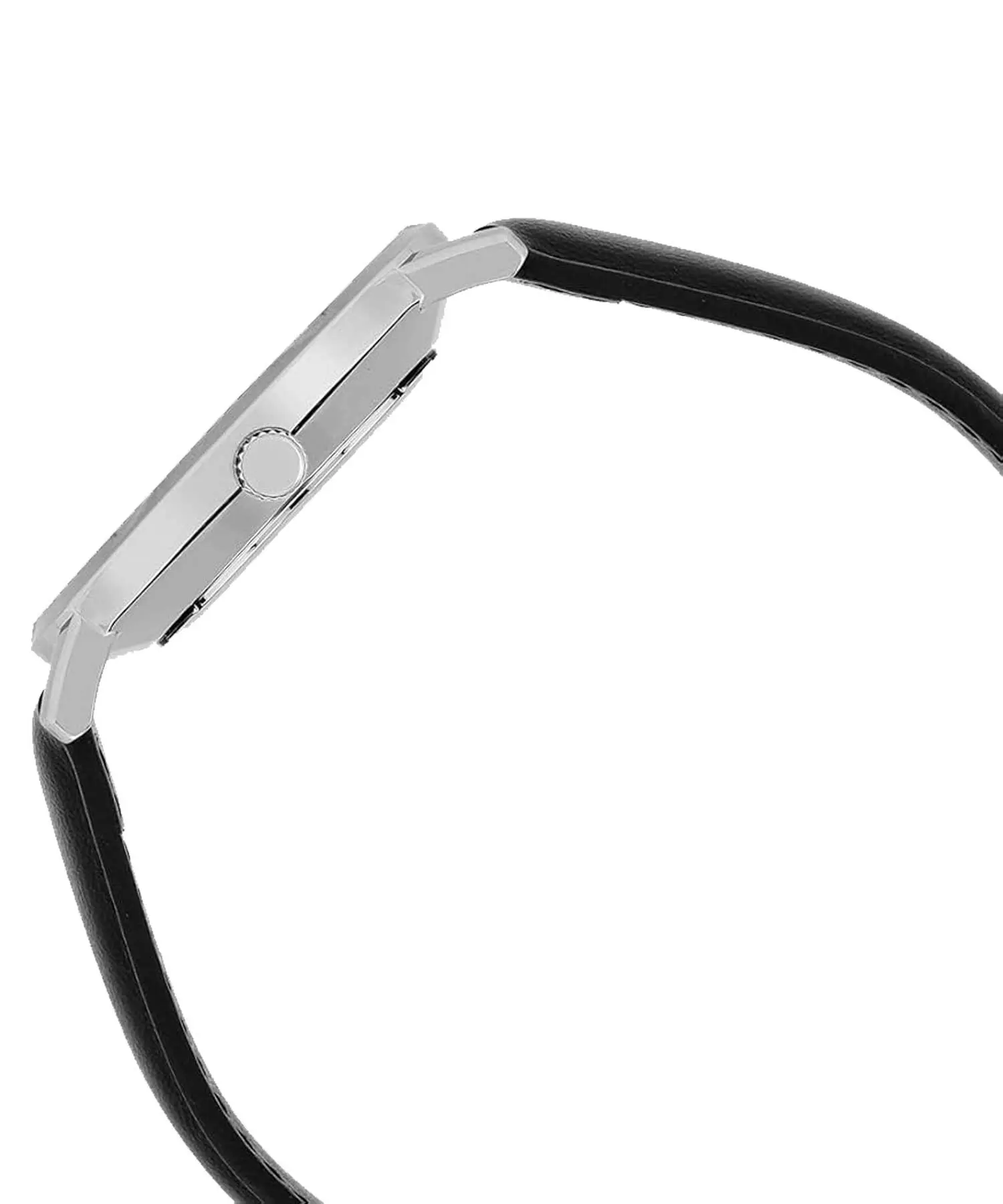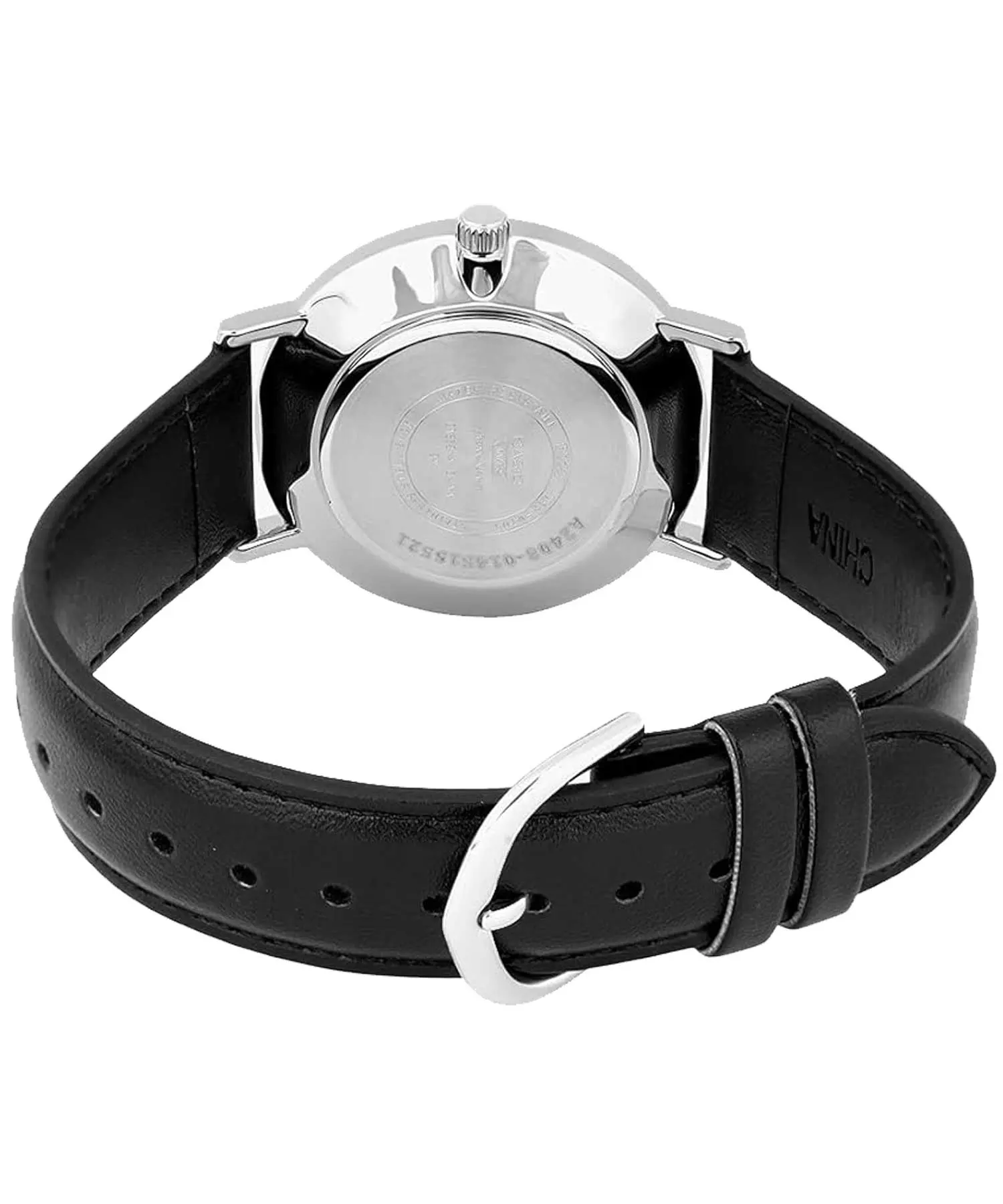 قاب گرد ساعت از آبکاری یونی نقرهای ساخته شده و شیشهی معدنی آن مقاومت مناسبی در برابر خط و خشهای روزمره ارائه میدهد. بند چرم طبیعی مشکی با قفل سگکی ساده راحتی و امنیت بالایی در استفاده فراهم میکند و قابل تنظیم بین 175 تا 215 میلیمتر است. وزن سبک ۴۴ گرم باعث میشود ساعت روی دست حس راحتی و سبکی داشته باشد.