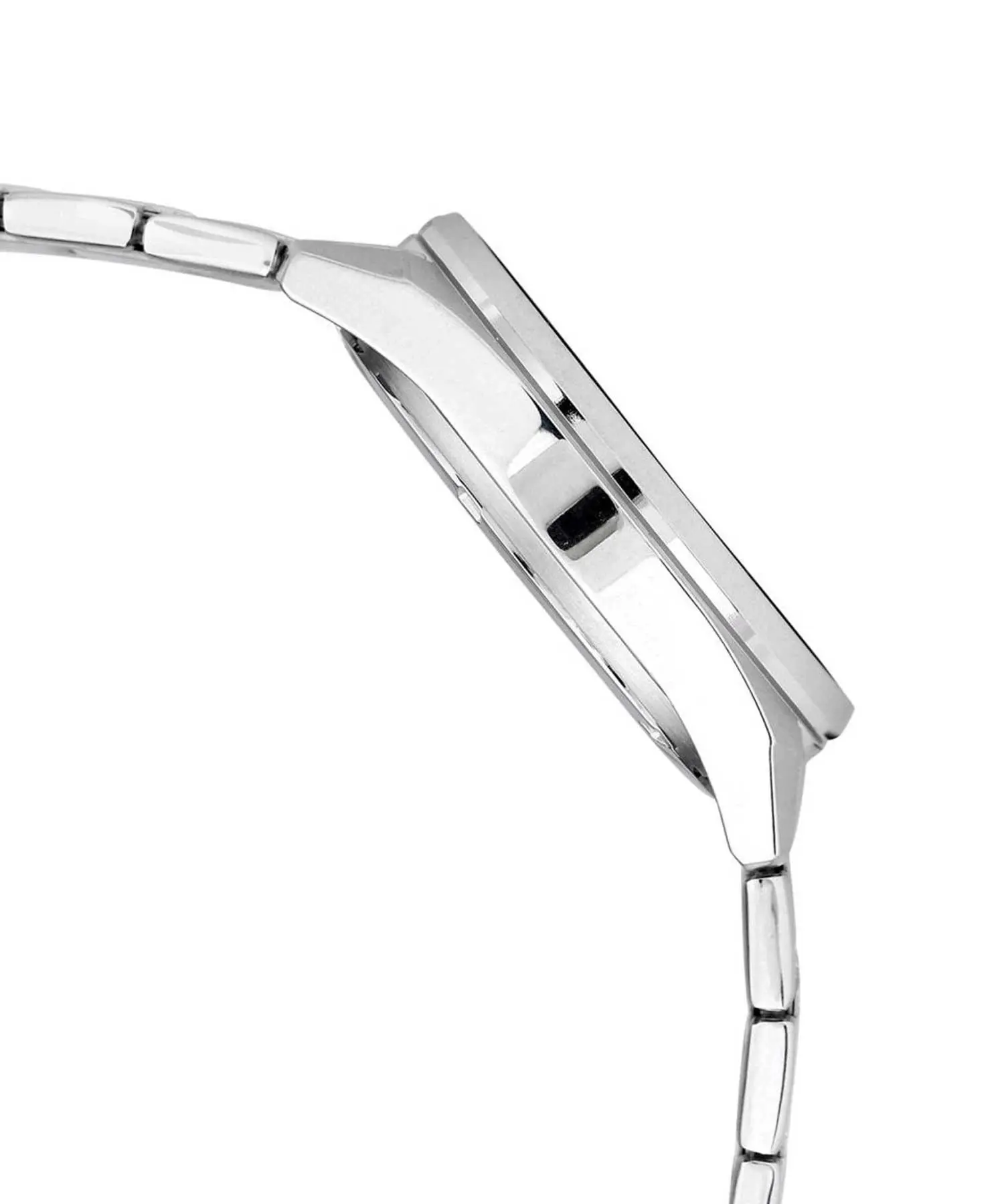 بدنه، قاب و بند این مدل از استیل ضدزنگ باکیفیت ساخته شدهاند که علاوه بر جلوه براق و حرفهای، مقاومت بسیار خوبی در برابر خوردگی، رطوبت و استفاده روزمره دارند. فرم گرد قاب در کنار ابعاد ۴۸.۶ × ۴۳.۵ میلیمتر و ضخامت ۱۱ میلیمتر، حضور مناسبی روی مچ دست ایجاد میکند و بدون ایجاد حس سنگینی، جلوهای شیک و جدی به استایل میبخشد. وزن ۱۲۸ گرم نیز نشاندهنده استحکام و کیفیت ساخت مطلوب این ساعت است.
