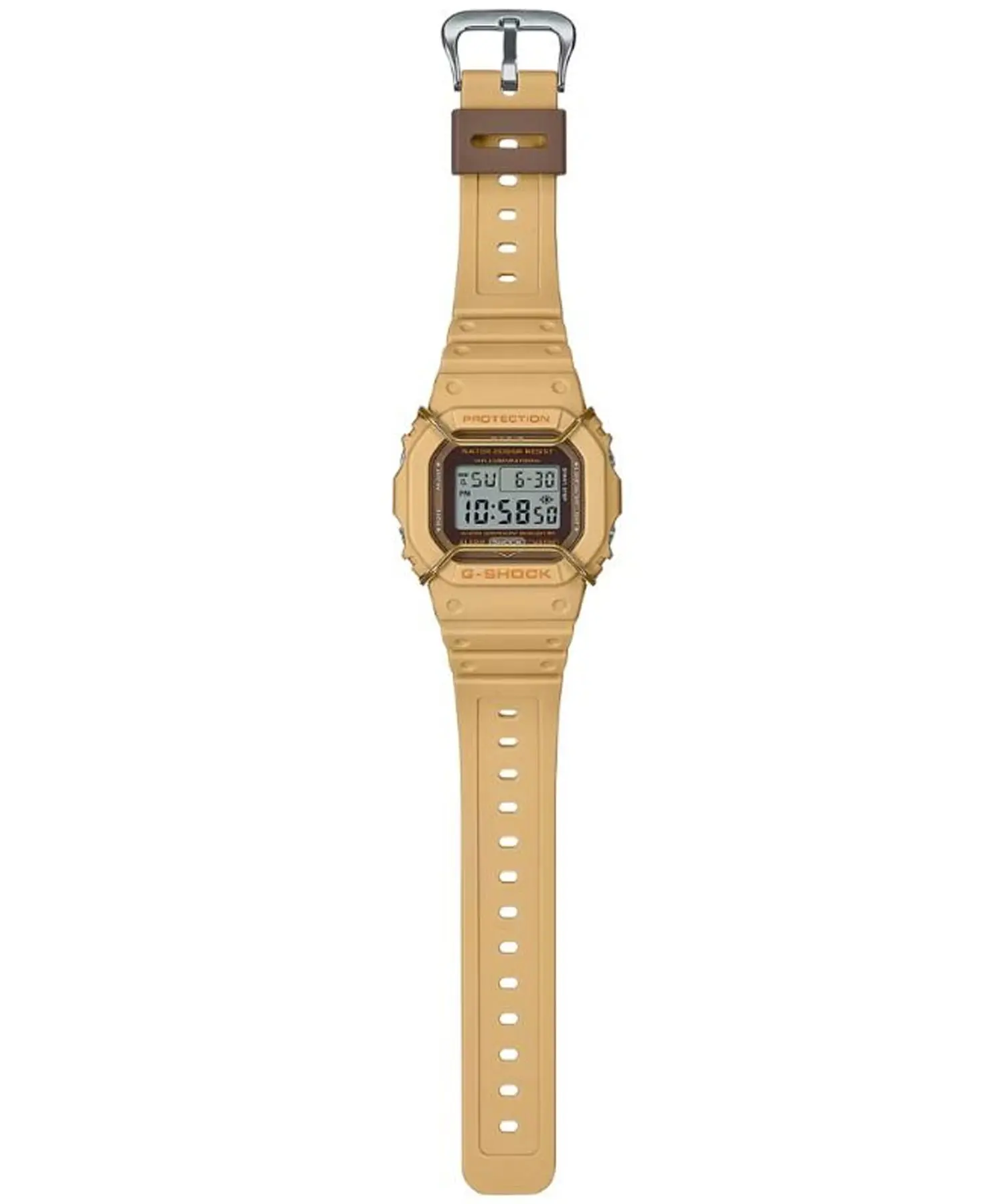 ساعت مچی مردانه G-SHOCK مدل CASIO-DW-5600PT-5DR یکی از نسخههای خاص و چشمگیر سری کلاسیک 5600 است؛ مدلی که با ترکیب رنگهای قهوهای/مسی و کرم/بژ ظاهری گرم، متفاوت و امروزی دارد و در عین حال تمام ویژگیهای مقاوم و حرفهای جیشاک را حفظ کرده است.