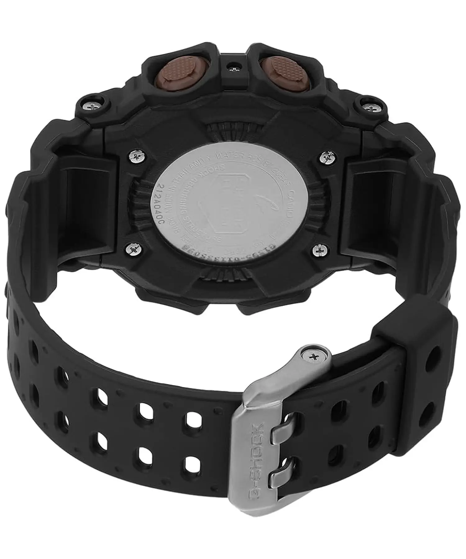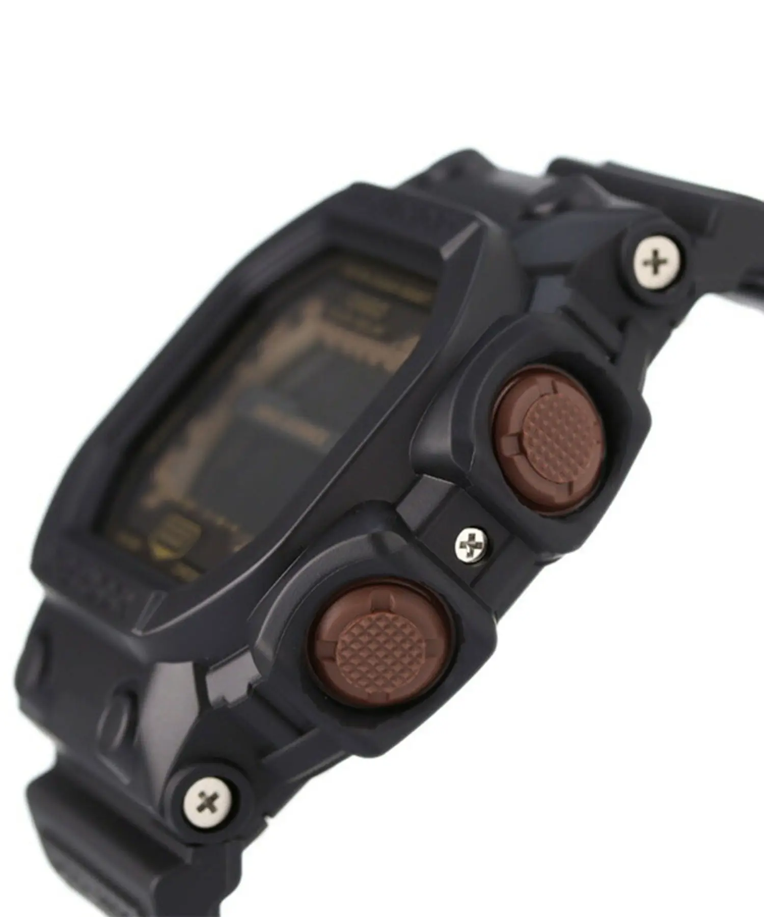 این ساعت با طراحی مربع/مستطیل کلاسیک G-SHOCK و بدنهای از رزین مقاوم ارائه شده و در برابر شوک، ضربه و فشارهای محیطی عملکردی بینقص دارد. رنگ کاملاً مشکی / دودی تیره در بدنه، بند و صفحه، ظاهری حرفهای و تماماً اسپرت ایجاد کرده که مناسب استفاده روزمره، ورزشی و حتی شرایط سخت محیطی است.
