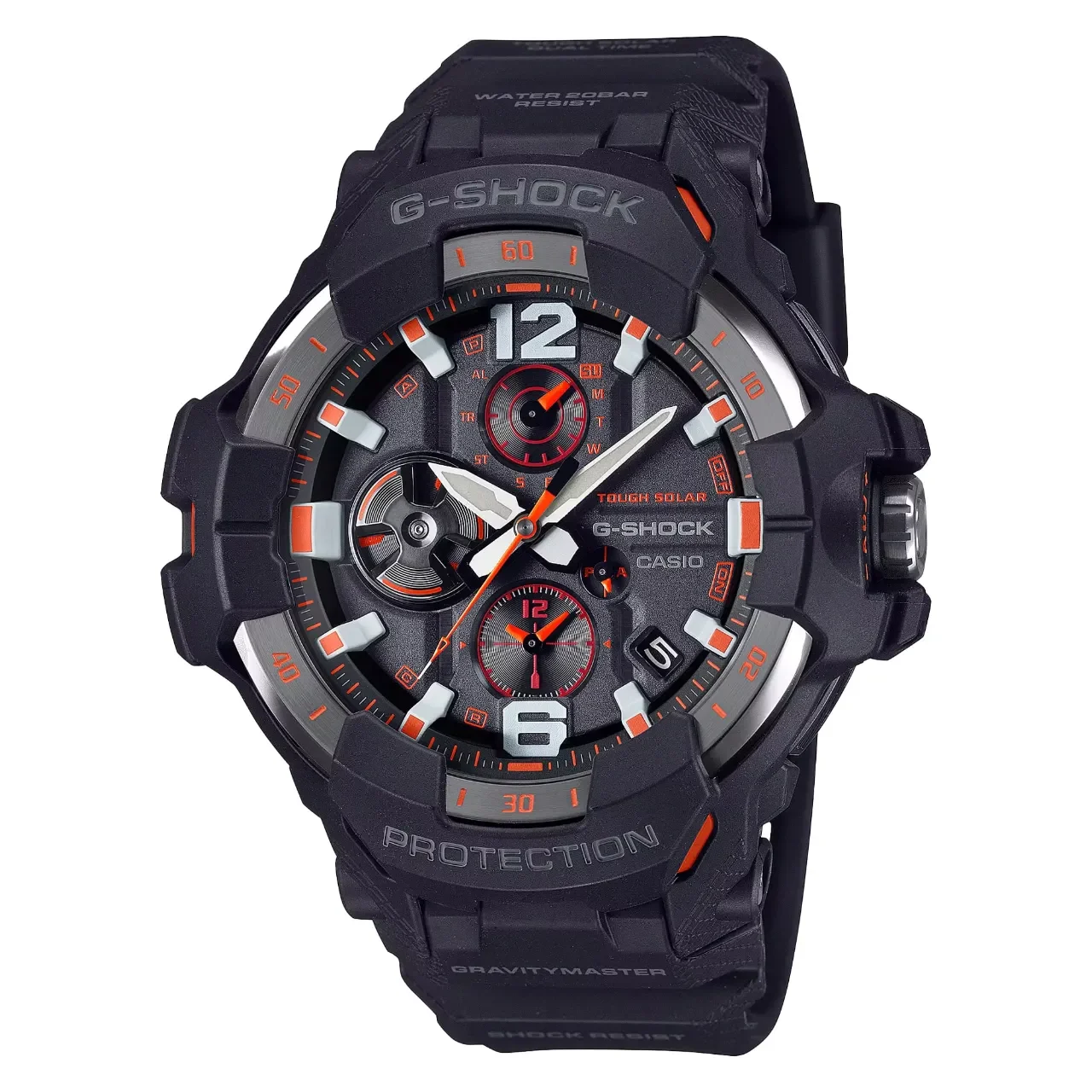 ساعت مچی مردانه G-SHOCK کاسیو مدل GR-B300-1A4DR یکی از حرفهایترین مدلهای سری Gravitymaster است که برای عملکرد پایدار در شرایط سخت طراحی شده و با ظاهری مدرن، ترکیب رنگهای قدرتمند و ساختاری فوقالعاده مقاوم شناخته میشود. این مدل با استفاده از رزین و کربن تقویتشده در ساخت بدنه و قاب، دوام بسیار بالایی ارائه میدهد و در عین حال وزن سبک آن راحتی کامل روی مچ را تضمین میکند. طراحی صفحه با جزئیات دقیق و ترکیب رنگ مشکی، دودی و نارنجی جلوهای پرانرژی و اسپرت ایجاد کرده و نمایش آنالوگ و دیجیتال امکان خوانش سریع و کاربردی را فراهم میسازد. این ساعت با مقاومت در برابر آب تا عمق 200 متر گزینهای مناسب برای ورزشکاران، استفاده روزمره و فعالیتهای پرتحرک است. بند از جنس رزین زیستپایه ساخته شده و علاوه بر دوام، سبک و سازگار با محیطزیست است. بهرهگیری از باتری خورشیدی، شارژدهی پایدار و بدون نیاز به تعویض مکرر باتری را تضمین میکند و مکانیزم مقاوم ضد ضربه و ضد شوک، امنیت کامل ساعت را حتی در سختترین شرایط فراهم میسازد. اندازه قابل توجه 59×54.7×15.7 میلیمتری در کنار وزن 71 گرم، این مدل را به گزینهای مستحکم و در عین حال خوشدست تبدیل کرده است. قفل سگکی ساده، تنظیم بند را آسان کرده و شیشه معدنی مقاوم از صفحه محافظت میکند. این مدل برای آقایانی که به دنبال ساعتی مقاوم، اسپرت، مدرن و قابل اعتماد هستند انتخابی ایدهآل محسوب میشود.