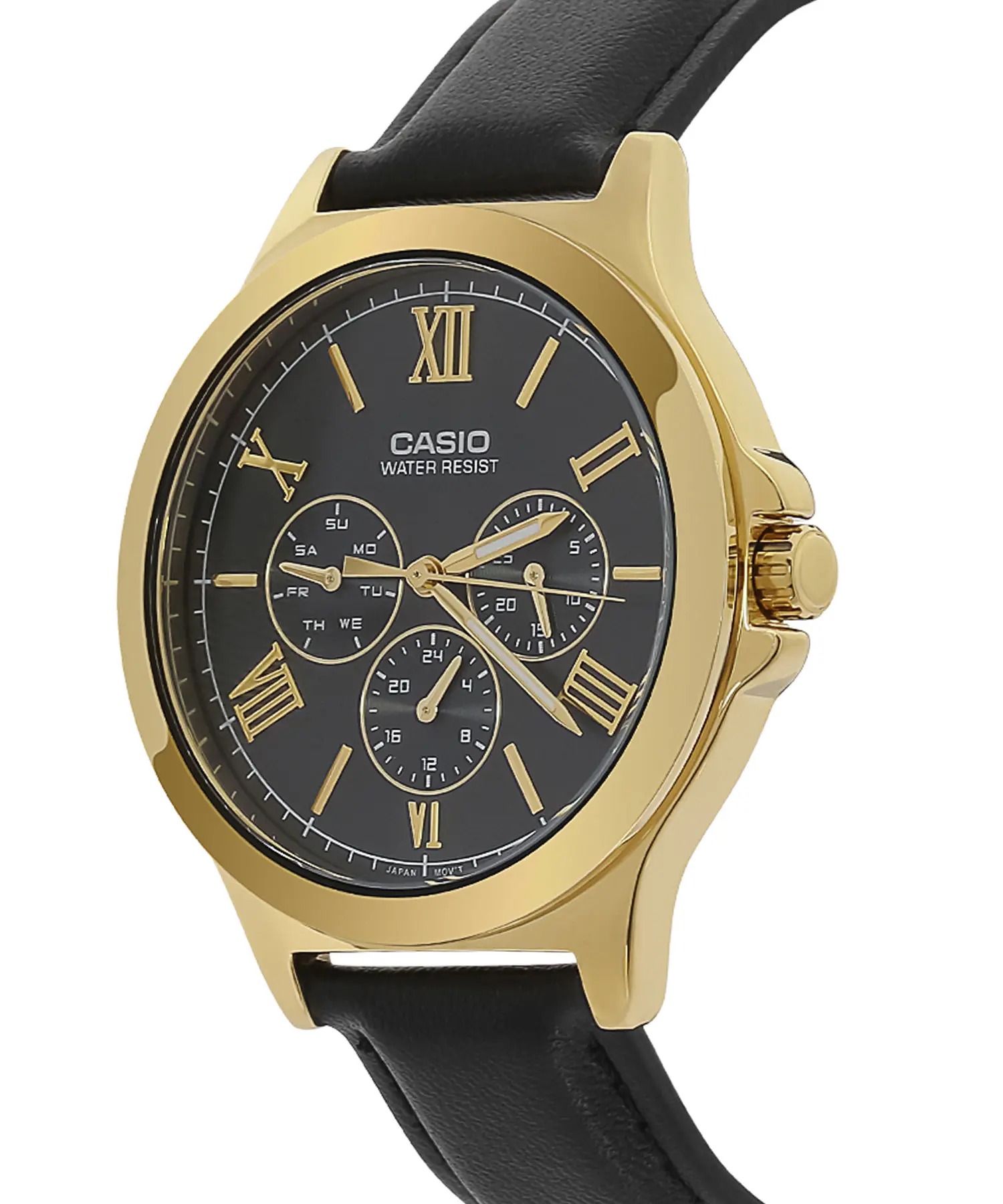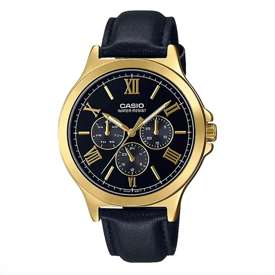 ساعت مچی مردانه CASIO MTP-V300GL-1AUDFF یکی از شیکترین و کلاسیکترین ساعتهای مردانه برند کاسیو است که با طراحی لوکس و اصیل خود، انتخابی ایدهآل برای آقایان خوشسلیقه به شمار میآید. ترکیب رنگ جذاب طلایی با صفحه مشکی جلوهای مجلسی، رسمی و چشمنواز ایجاد کرده و باعث میشود این ساعت حتی در نگاه اول، توجهها را به خود جلب کند. طراحی سه موتوره (Multi Function) با نمایش تاریخ، روز و عقربه 24 ساعته، علاوه بر افزایش کاربرد، ظاهر ساعت را حرفهایتر و مدرنتر کرده است.