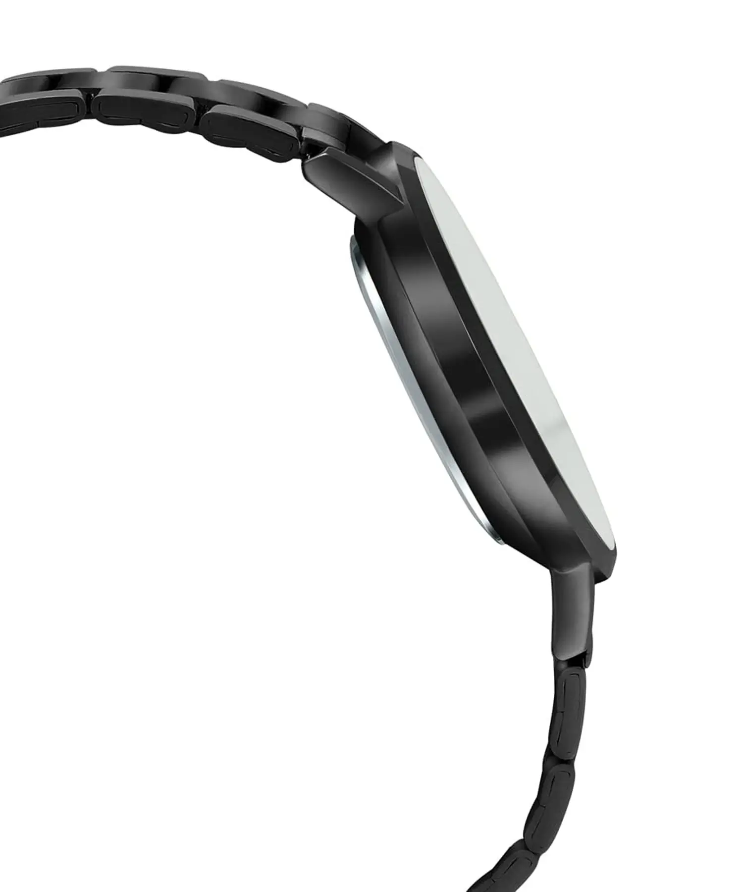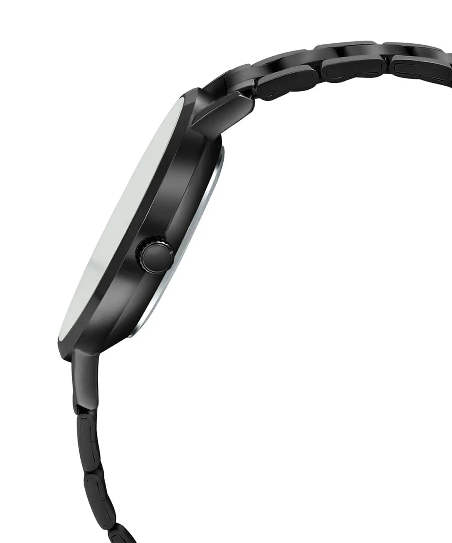 بدنه و بند از جنس استیل مقاوم با رنگ مشکی / دودی تیره طراحی شده که جلوهای مدرن، رسمی و حرفهای ایجاد کرده و برای استایلهای اداری، رسمی و حتی نیمهکلاسیک کاملاً مناسب است. صفحه ساعت نیز در رنگ مشکی / دودی تیره بوده و با اندکسهای ساده و مینیمال، ظاهری تمیز و جذاب به ساعت بخشیده است.