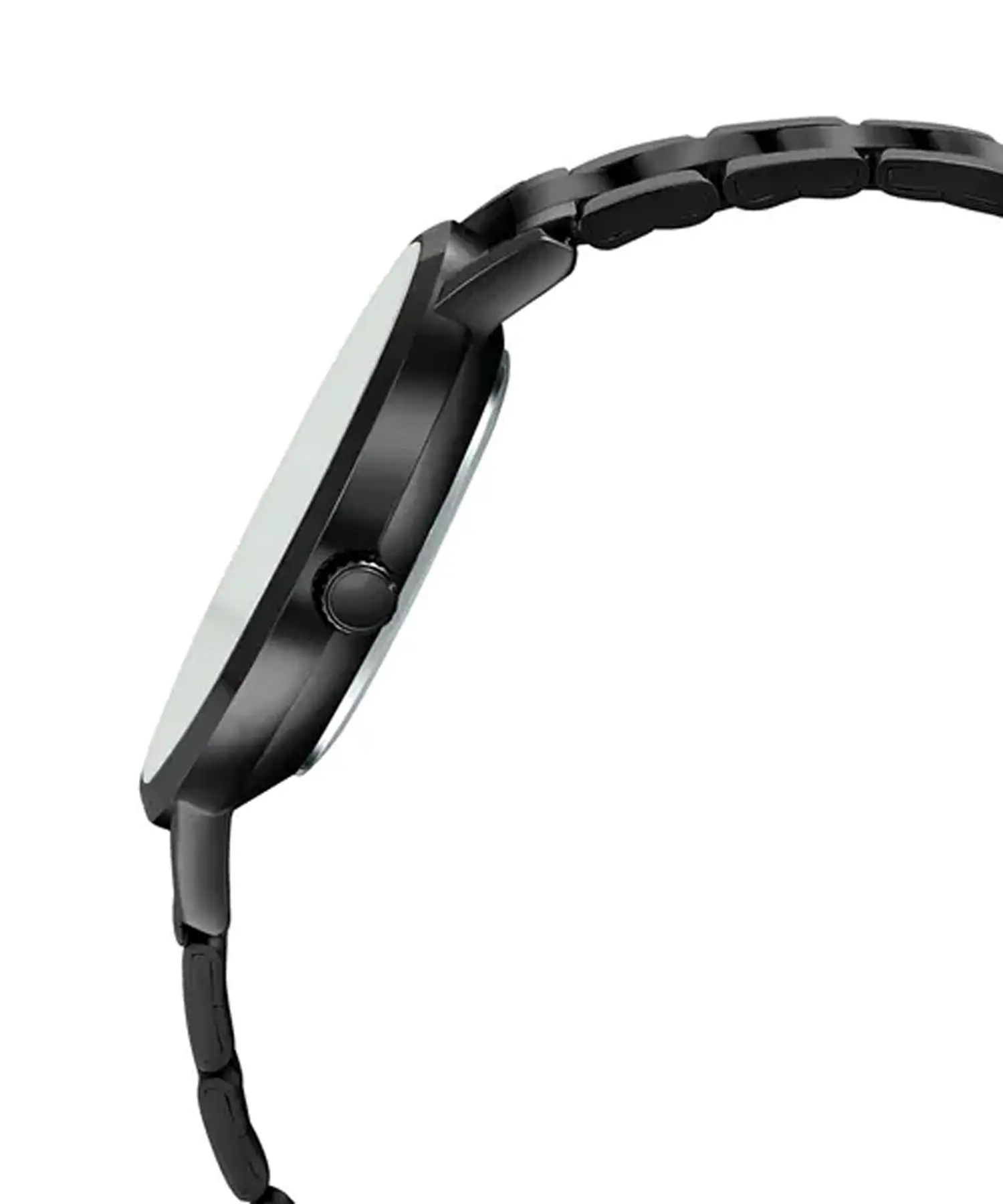 بدنه و بند ساعت از جنس استیل مقاوم با رنگ مشکی / دودی تیره ساخته شده که ظاهری حرفهای، شیک و مردانه ایجاد میکند. ترکیب این رنگها با صفحه سرمهای جذاب و مینیمال جلوهای خاص به ساعت داده و باعث شده برای استایلهای رسمی، اداری، اسپرتشیک و حتی مهمانی بسیار مناسب باشد.