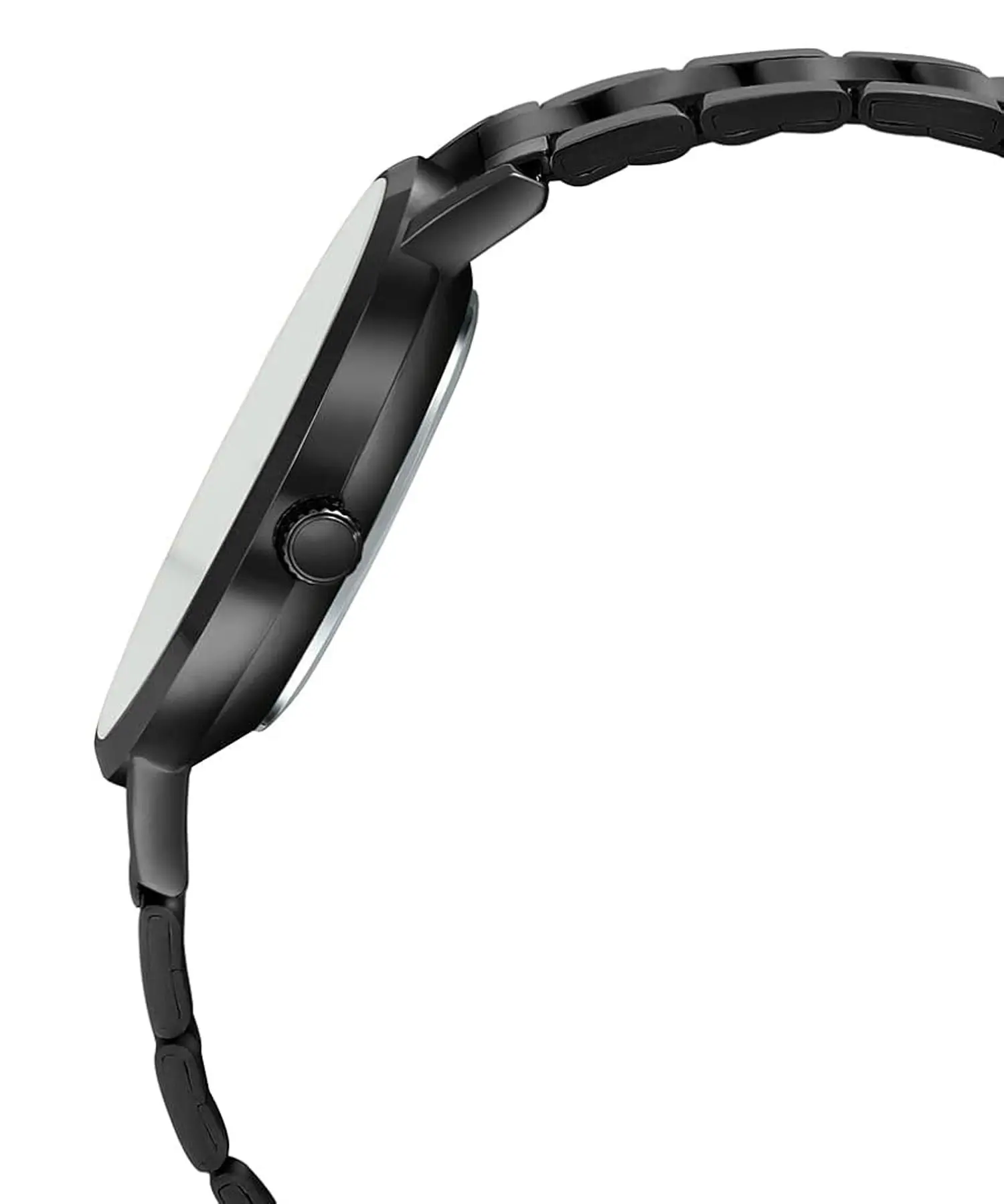 بدنه و بند از جنس استیل ضدزنگ با رنگ مشکی / دودی تیره طراحی شده که در کنار صفحه سفید کلاسیک و ساده جلوه‌ای ظریف، رسمی و مناسب استایل‌های اداری، رسمی و روزمره ایجاد می‌کند. طراحی مینیمال با اندکس‌های خطی، خوانایی بالا و ظاهری حرفه‌ای را ارائه می‌دهد.