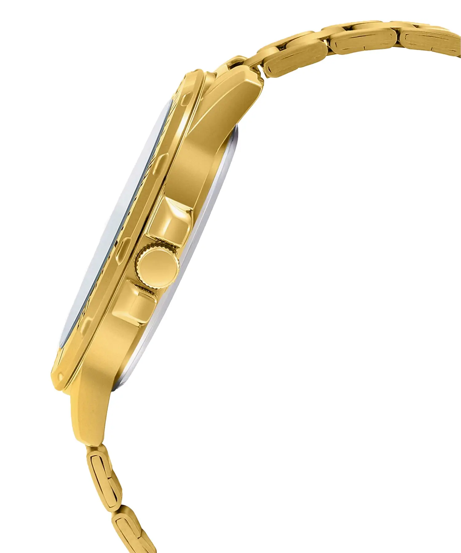 بدنه و بند از جنس استیل با روکش طلا ساخته شده که علاوه بر زیبایی، مقاومت و دوام بالایی دارد. رنگ طلایی بدنه و بند در کنار صفحه تیره و عقربههای خوانا تضادی جذاب و چشمنواز ایجاد کرده و ساعت را به یک اکسسوری شیک و حرفهای تبدیل میکند.