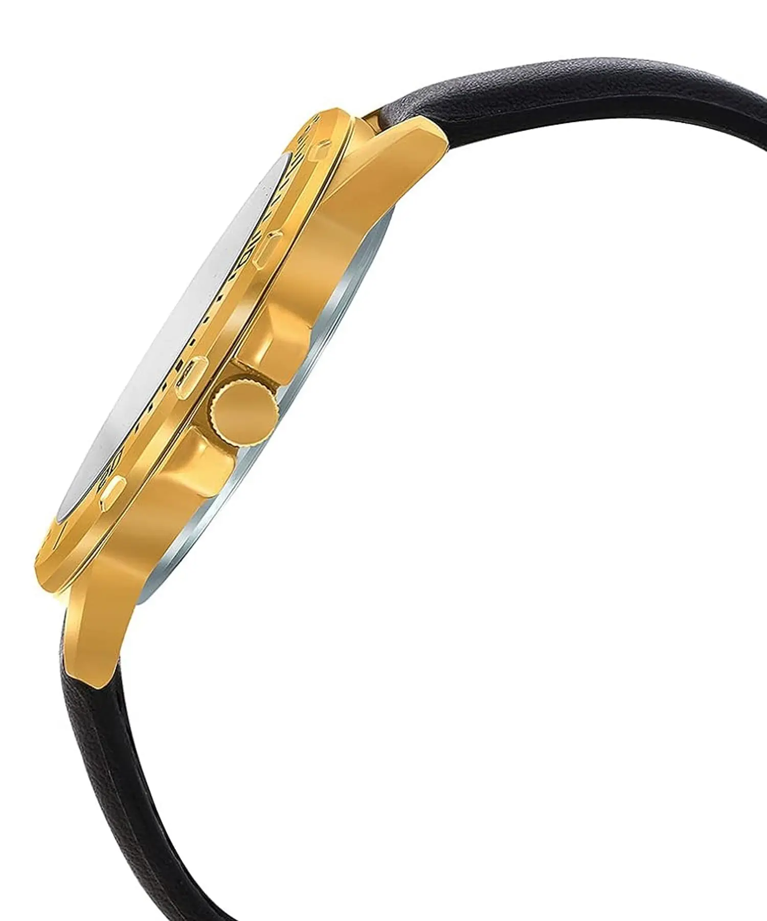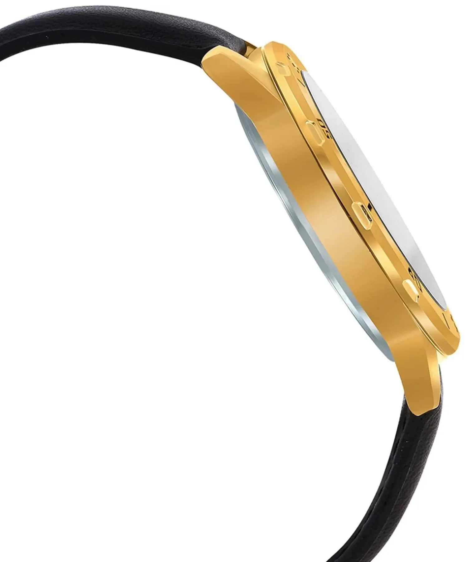 بدنه ساعت دارای روکش طلا با رنگ مشکی / دودی تیره است که در کنار صفحه طلایی و عقربههای خوانا جلوهای چشمگیر و متفاوت ایجاد کرده و مناسب استایلهای رسمی، اداری و حتی کلاسیک است. بند از جنس چرم مشکی / دودی تیره بوده و با قفل سگکی راحت، سبک و خوشفرم روی مچ قرار میگیرد.