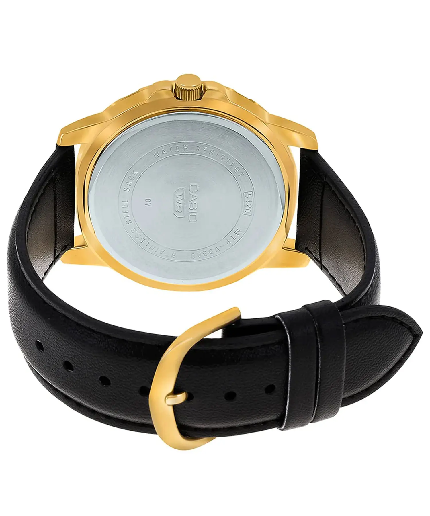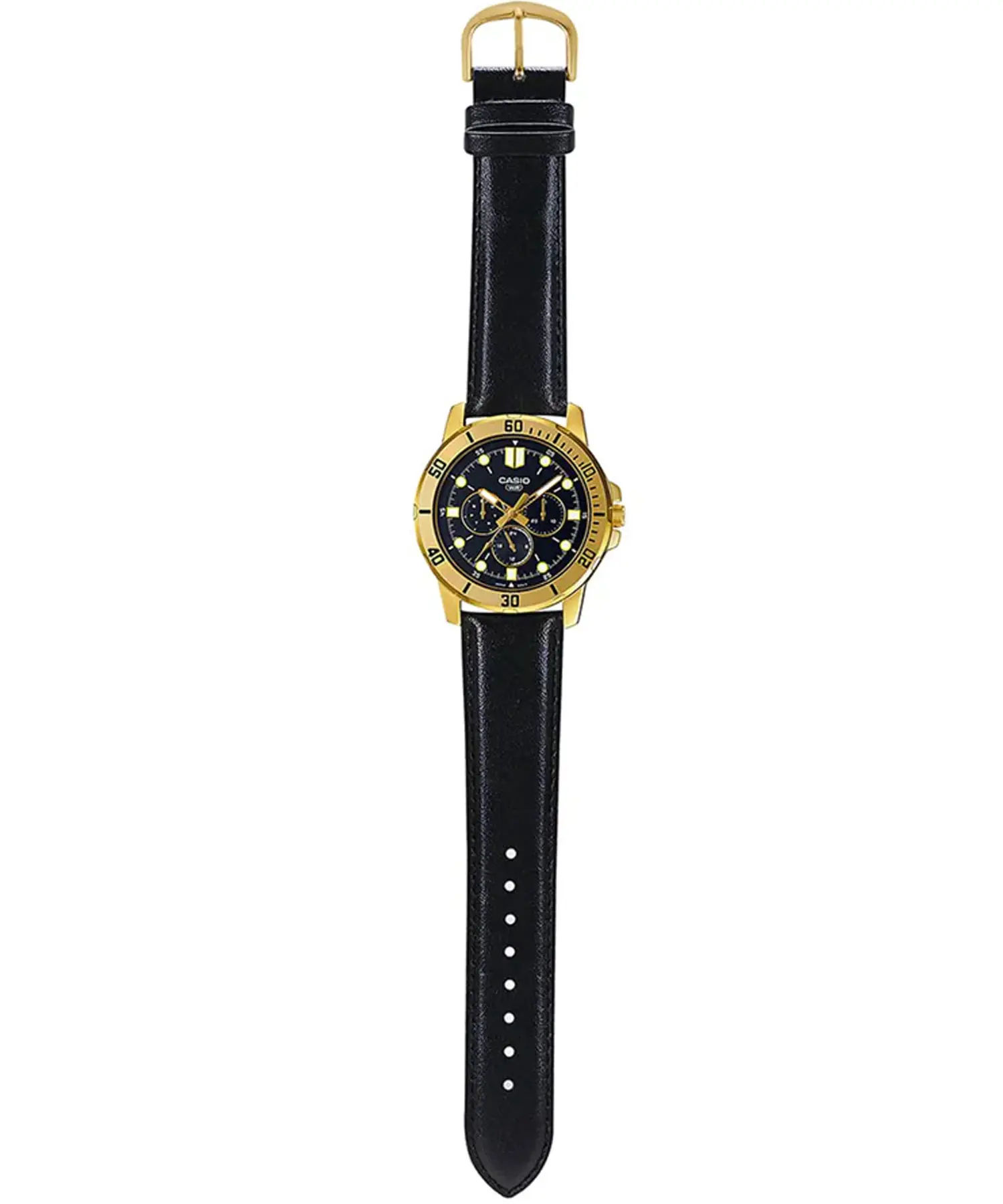 ساعت مچی کاسیو مدل CASIO-MTP-VD300GL-1E ترکیبی از طراحی کلاسیک، بند چرمی مشکی و صفحه طلایی جذاب است که ظاهری شیک و رسمی برای آقایان ایجاد میکند. این ساعت با نمایش آنالوگ، موتور کوارتز دقیق و منبع انرژی باتری معمولی، عملکردی قابلاعتماد و کممصرف ارائه میدهد.