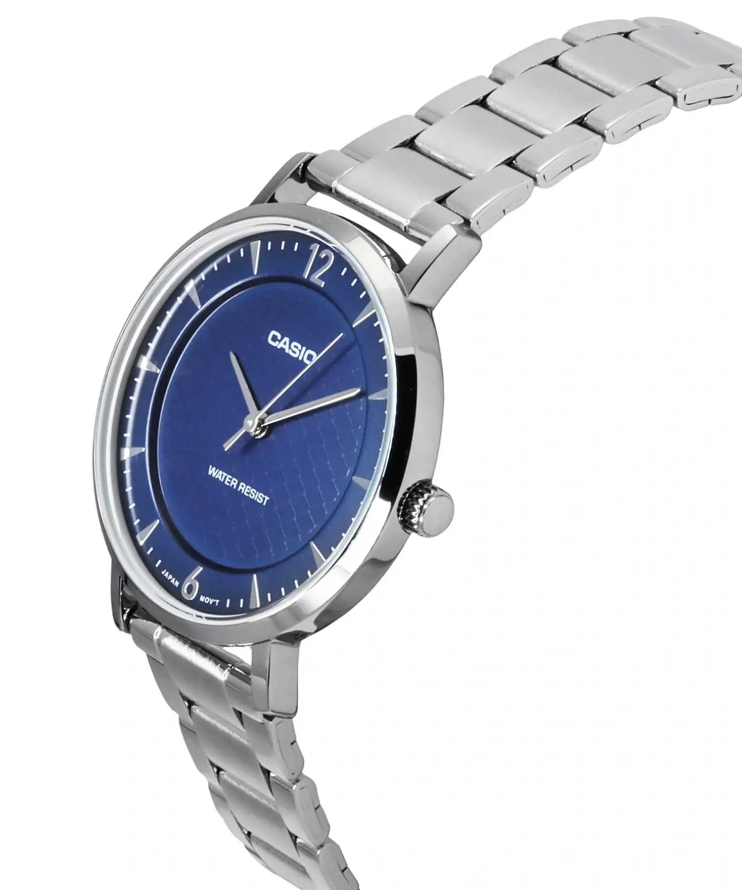 بدنه و بند ساعت از استیل ضدزنگ باکیفیت ساخته شده که دوام مناسب، مقاومت در برابر استفاده روزانه و حفظ ظاهر براق را در طول زمان تضمین میکند. رنگ نقرهای بدنه و بند در کنار صفحه آبی، ترکیبی کلاسیک و در عین حال مدرن ایجاد کرده که حس آرامش، ظرافت و شیکبودن را به استایل اضافه میکند. فرم گرد قاب با ابعاد متناسب ۴۰ × ۳۴ میلیمتر و ضخامت بسیار کم ۷.۹ میلیمتر، باعث شده این ساعت روی انواع مچ دست بهخوبی بنشیند و جلوهای ظریف و مرتب داشته باشد. وزن سبک ۶۴ گرم نیز استفاده طولانیمدت را بدون ایجاد خستگی امکانپذیر میکند.